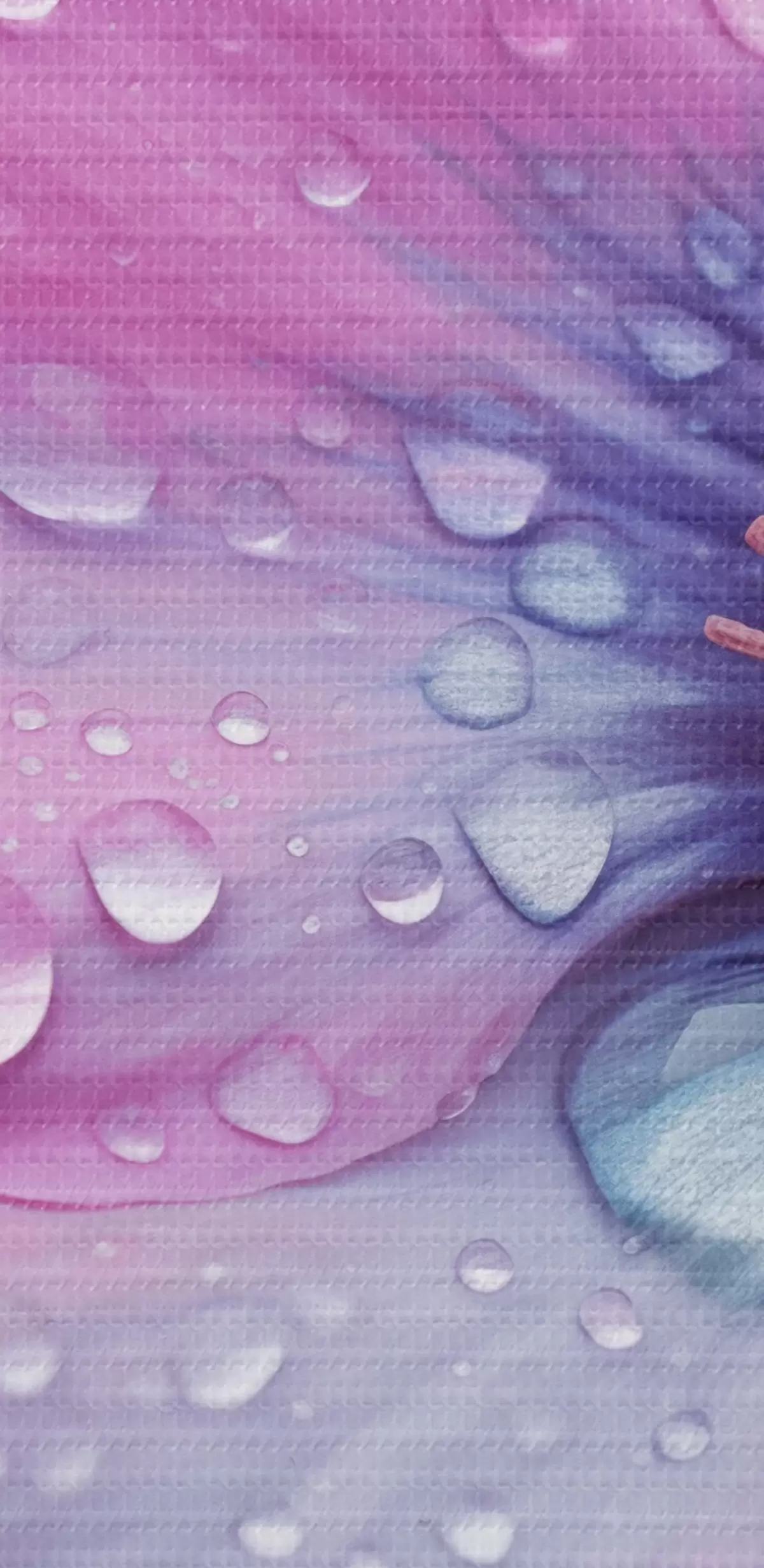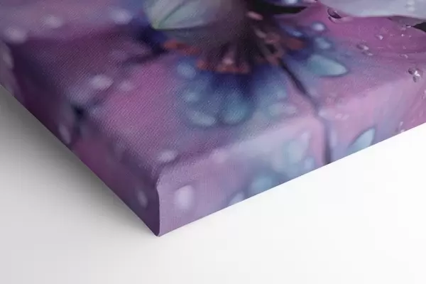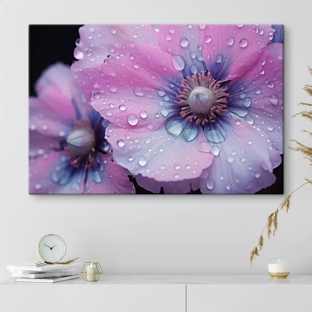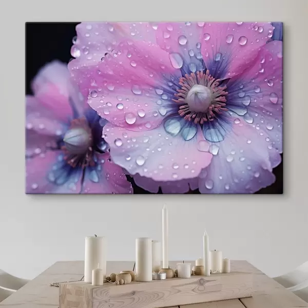 Maalid Roosad ja lillad õied täies õitsengus, kaetud veetilkadega, tumedal taustal Nr s43394