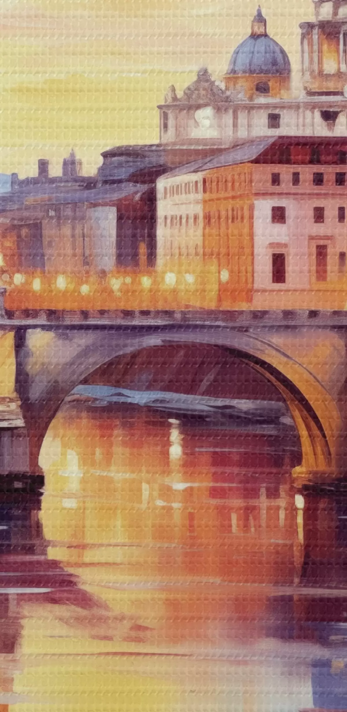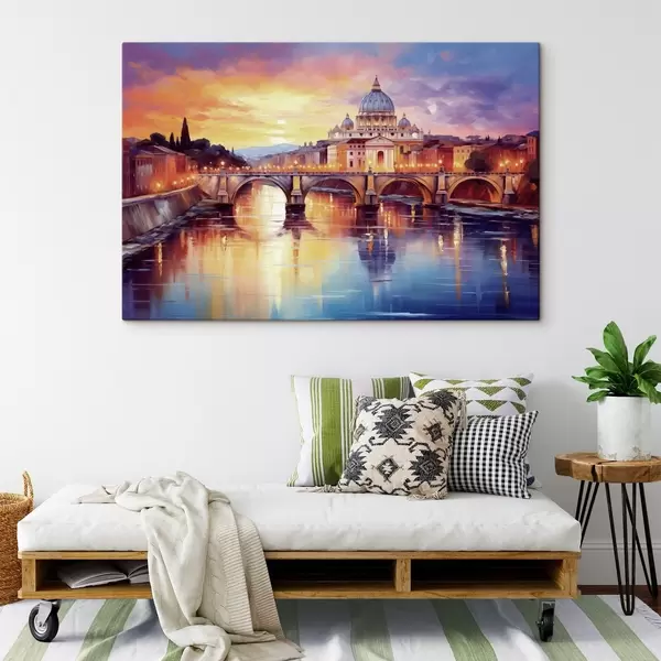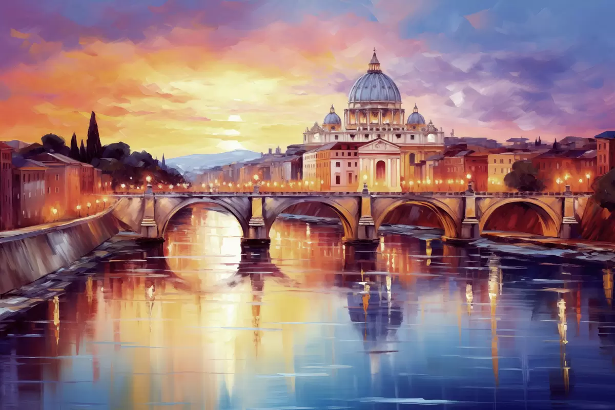 Maalid Püha Peetruse basiilika ja sild üle jõe päikeseloojangul, soojad värvid, peegeldus vees, õlimaali stiilis Nr s43396