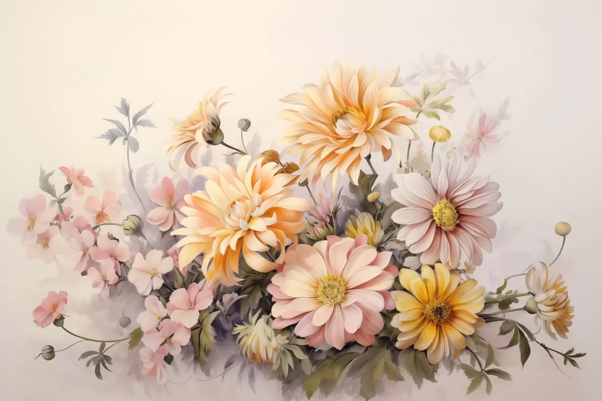 Maalid Roosa, kollase ja oranži värvi lillede kollektsioon, kerge taust, pehmed värvid, vintage stiilis, botaaniline illustratsioon Nr s43401