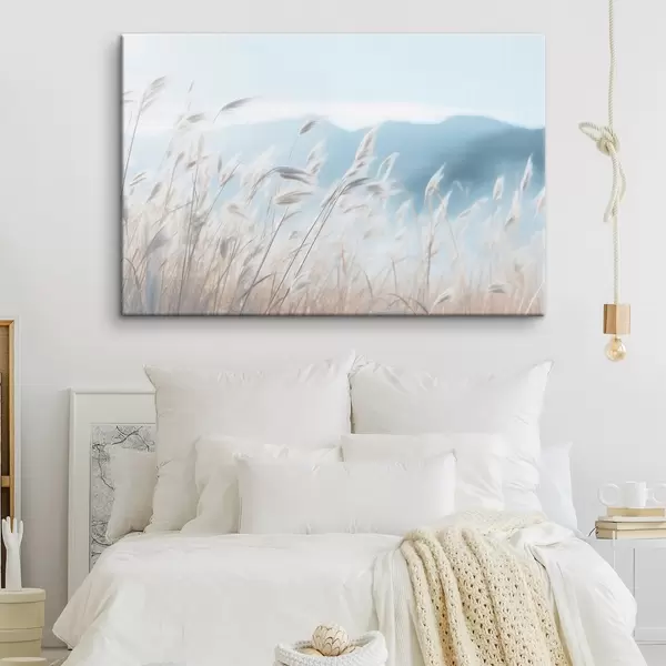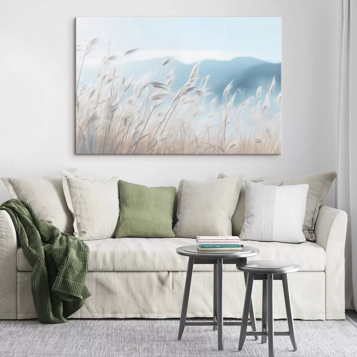 Maalid Rohi, pampa väli sinise mäega taustal, helesinine taevas, minimalistlik, pastelsed värvid Nr s43404