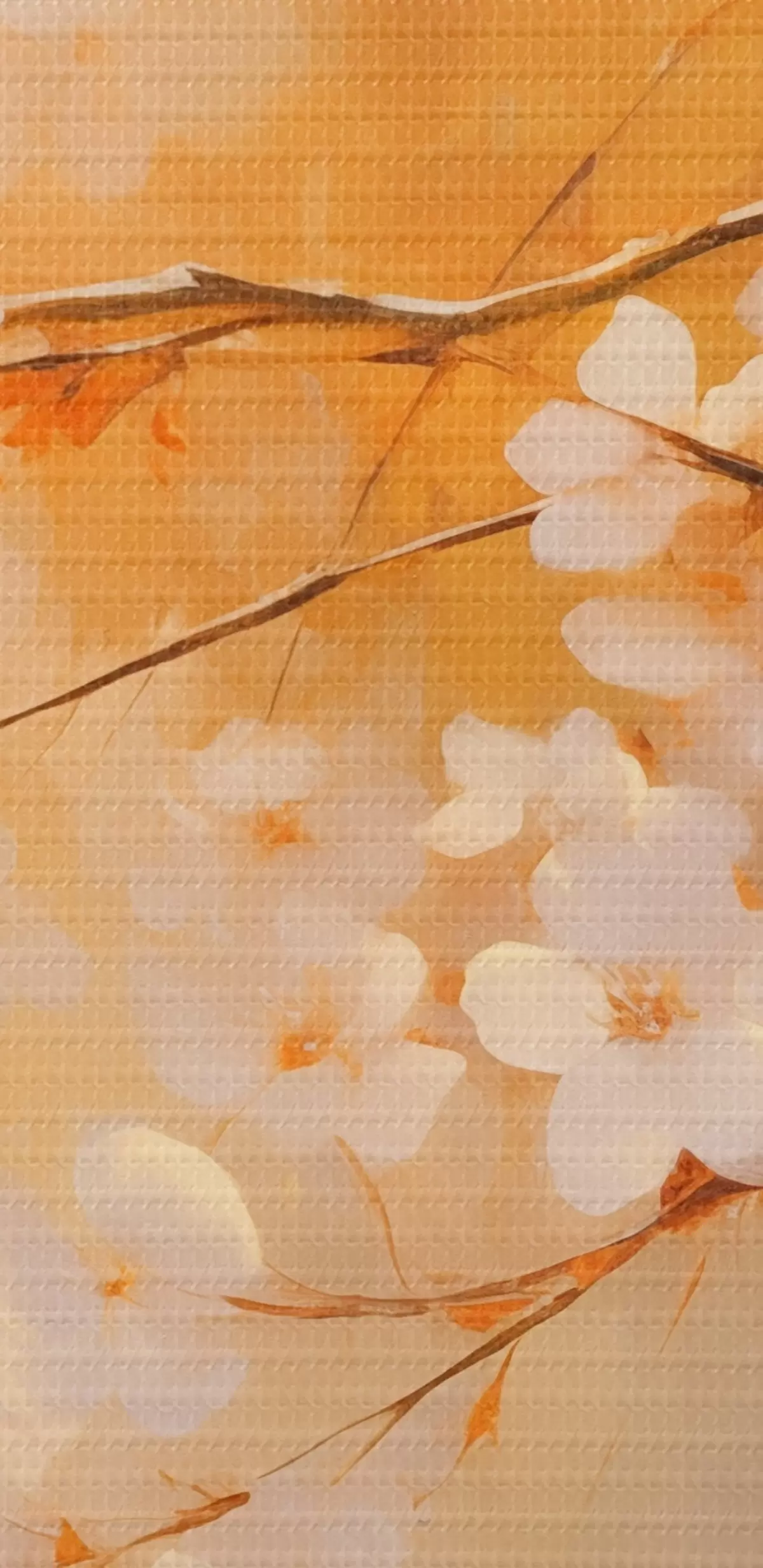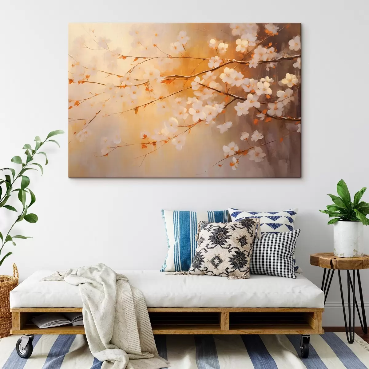 Maalid Kirsiõie oksad oranžide õitega, soe värvipalett, kollaste toonidega hägustatud taustal Nr s43407