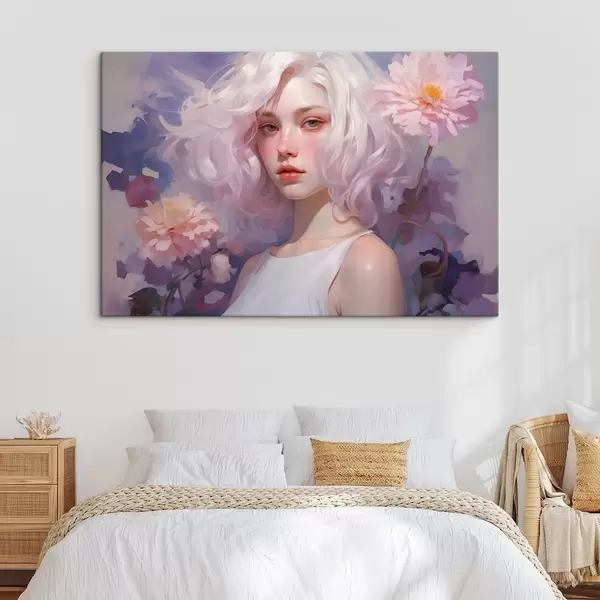 Maalid Kaunis tüdruk lilledes, akrüülstiilis joonistus, Jaapan, lillad värvid Nr s43495