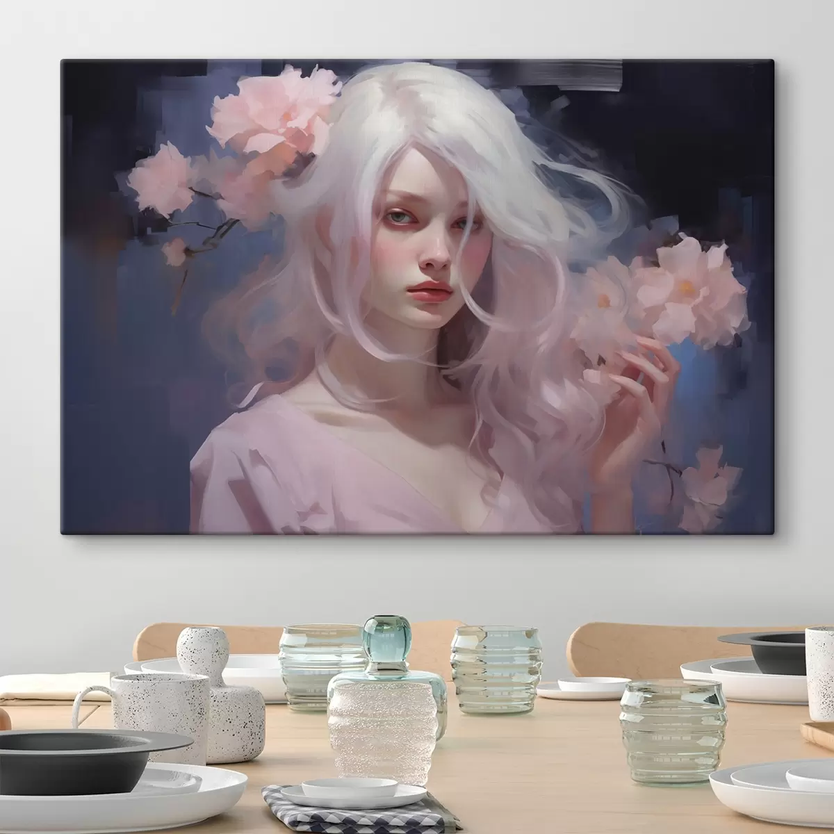 Maalid Tüdruk ploomidega, akrüülstiilis joonistus, tumedal taustal Nr s43496