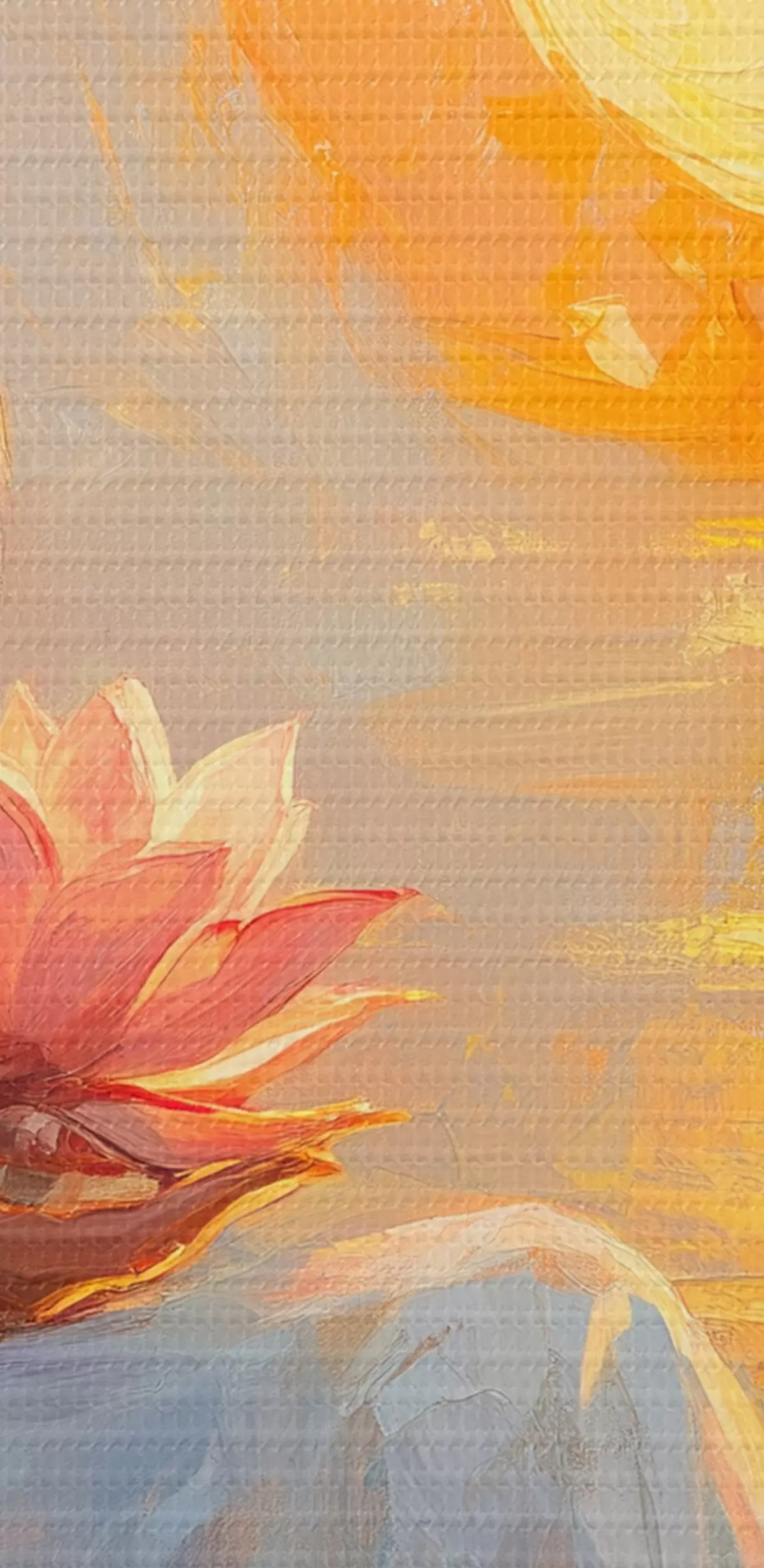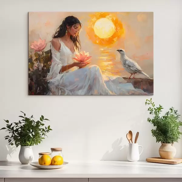 Maalid Naine lootoslillega päikeseloojangul, valge lind, õlistiilis joonistus Nr s43501