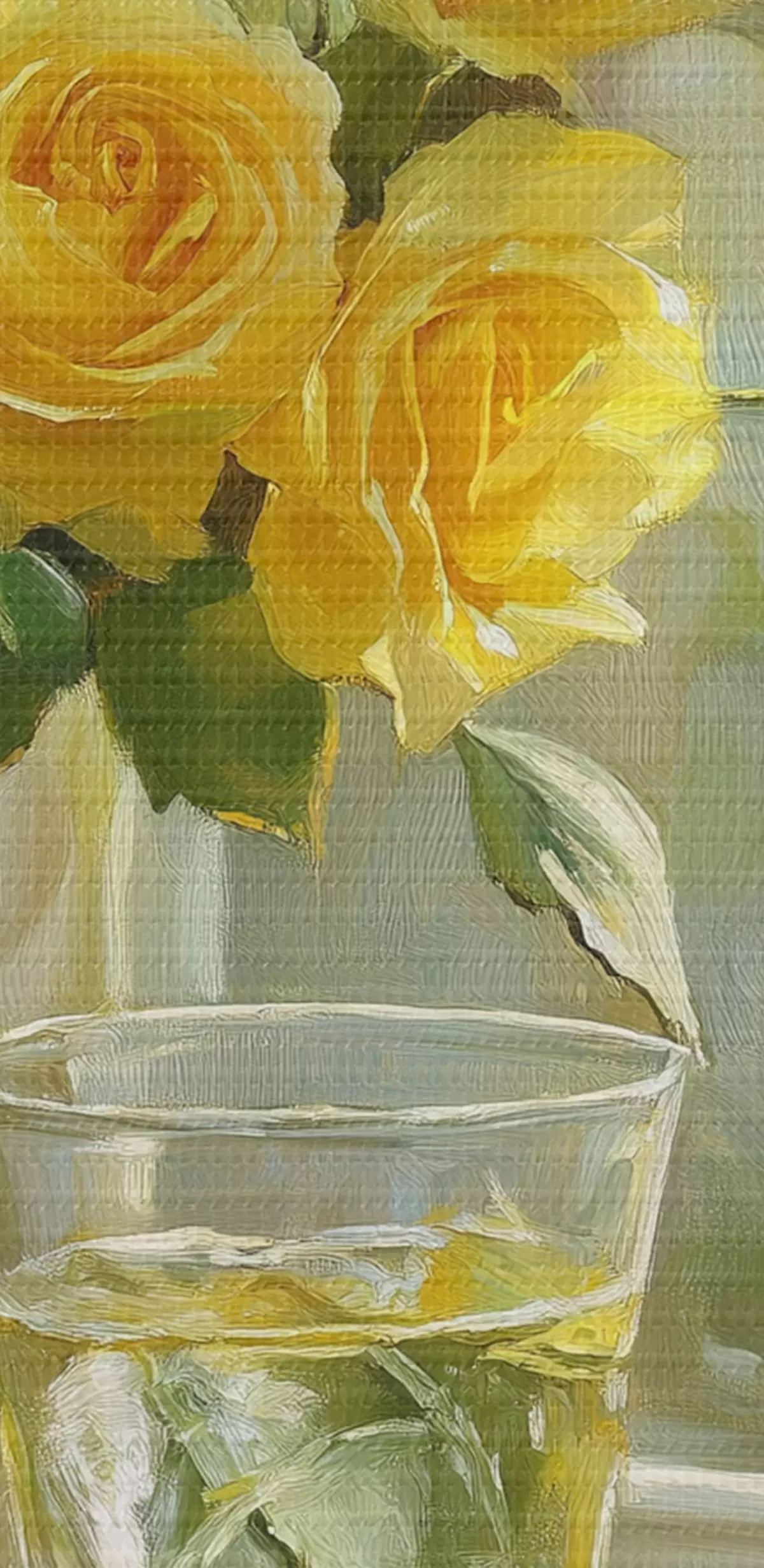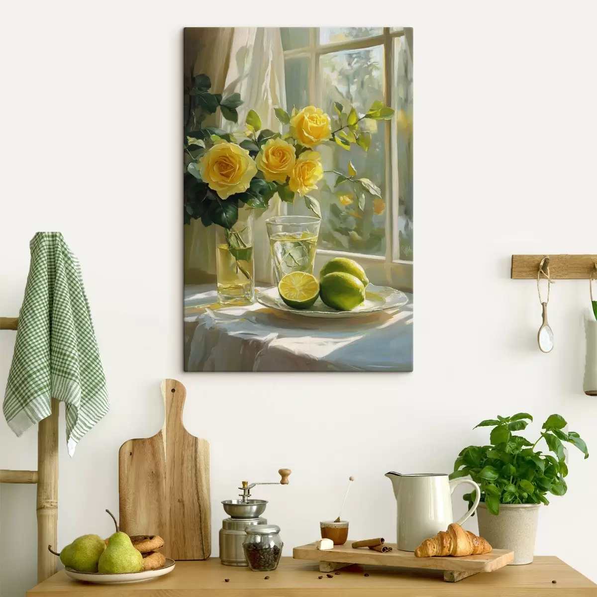 Maalid Ilusad kollased roosid vaasis akna kõrval, vesi koos laimidega Nr s43886