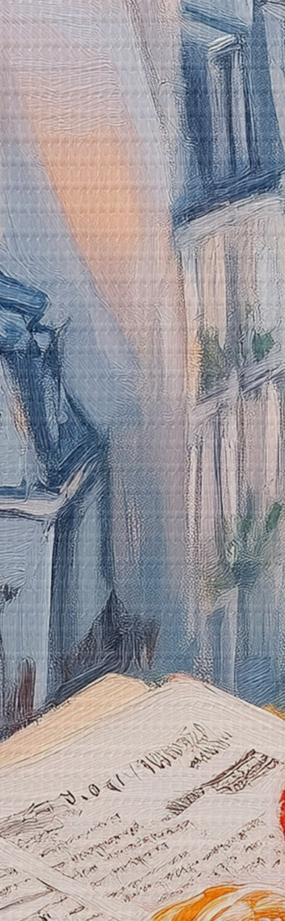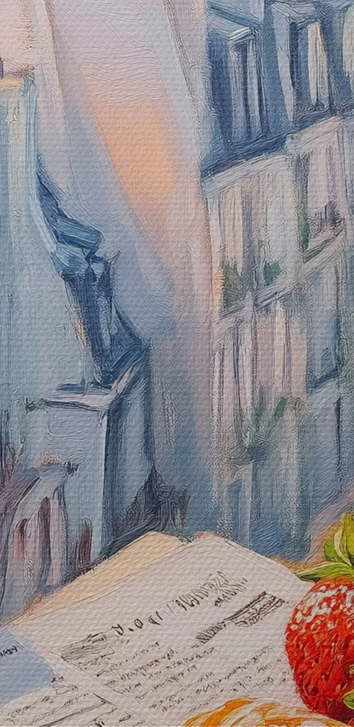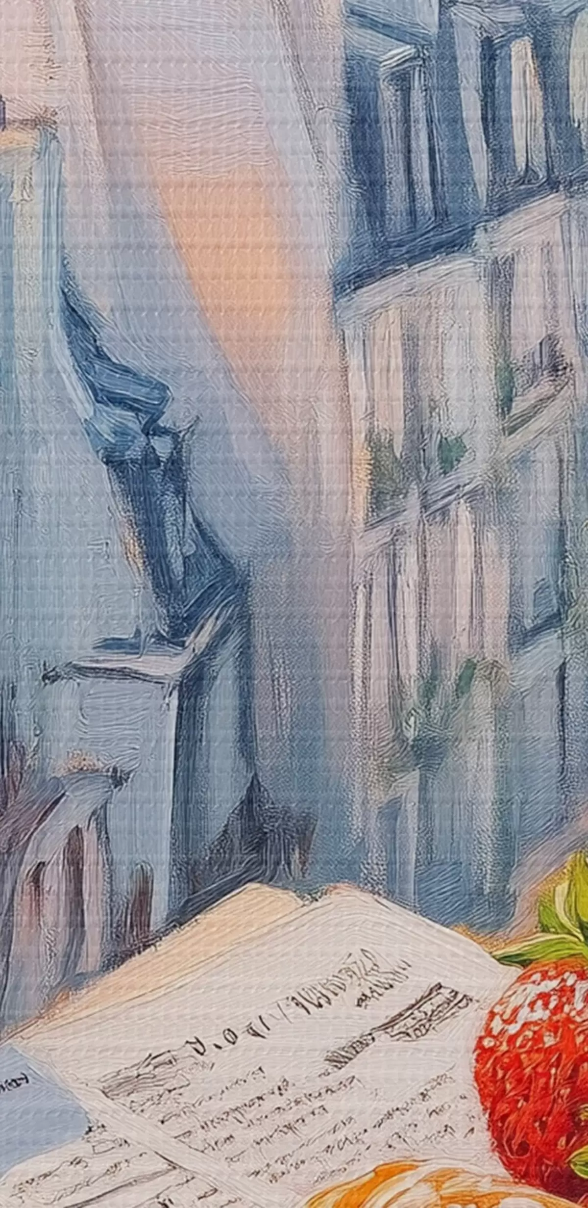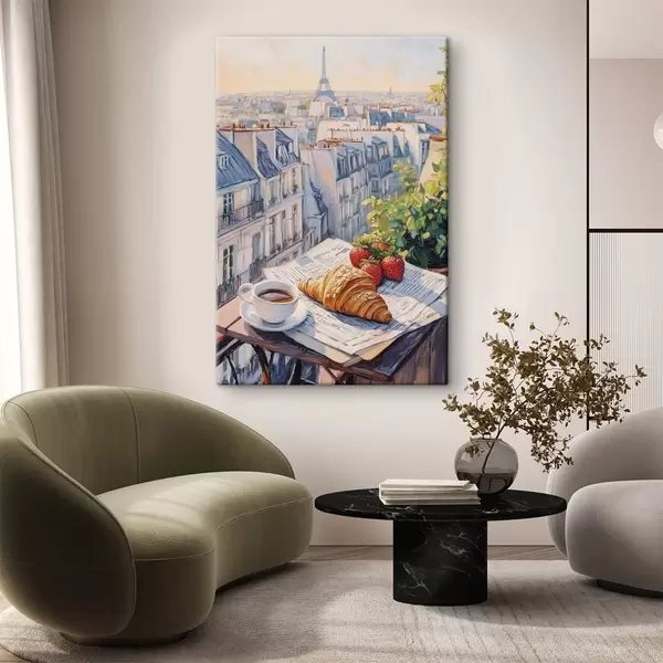 Maalid Päikesetõus Pariisis rõdul, Eiffeli torn, maasikad, kohv, päevik Nr s43890
