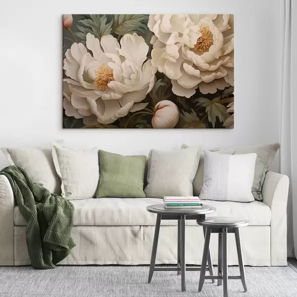 Maalid Roheliste lehtede vahel olevad kreemjad pioonid Nr s43991
