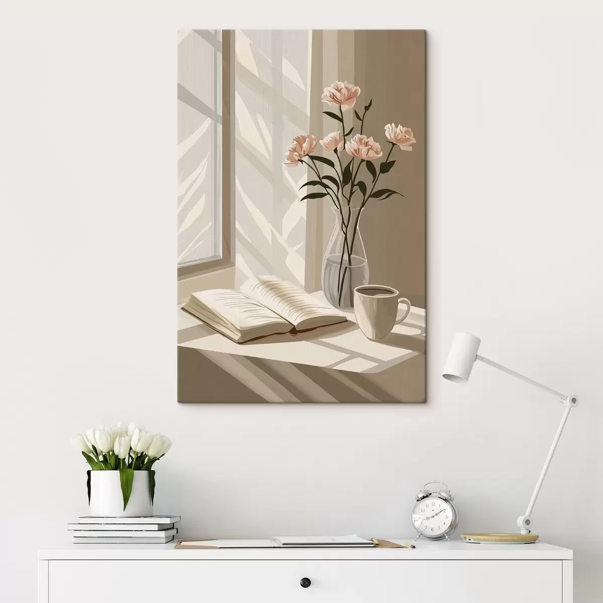 Maalid Hubane hommik kohvi ja raamatuga, roosad lilled, abstraktsioon Nr s44013