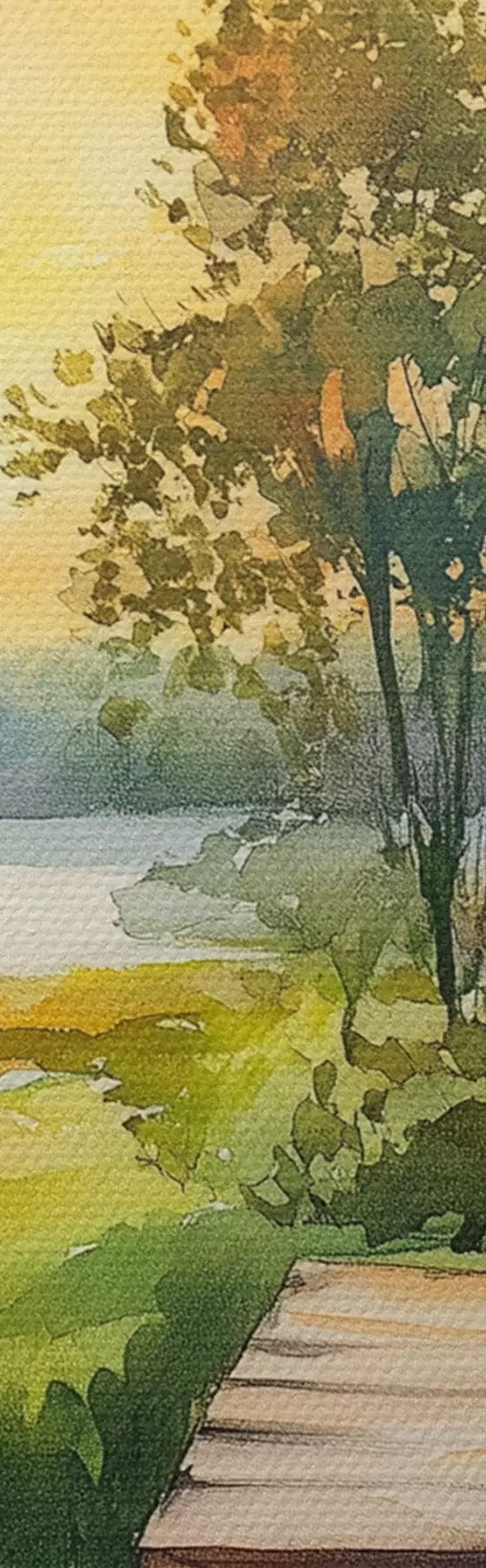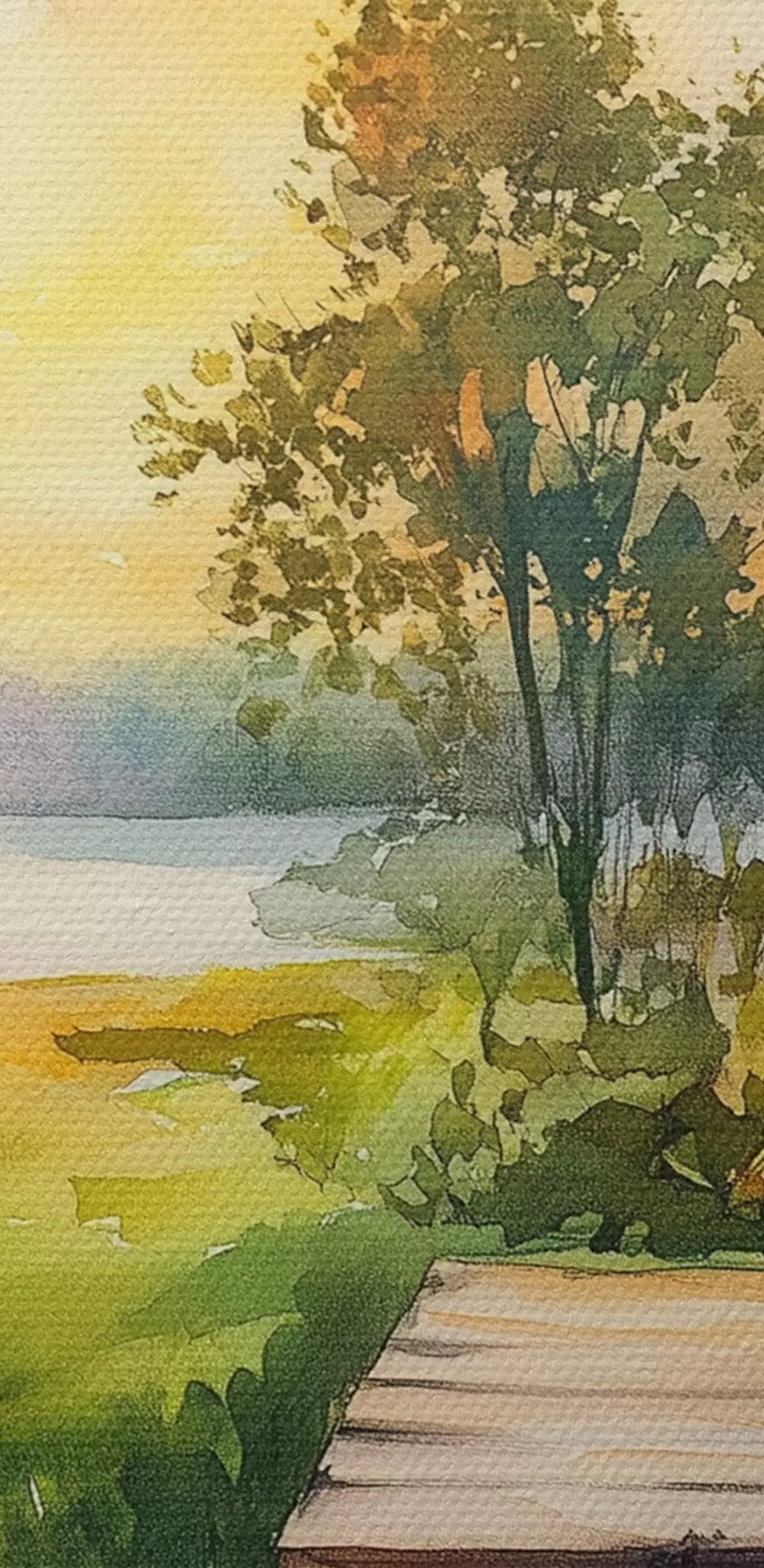 Maalid Päikeseloojangu värvid, talumaja, akvarellistiil, rustikaalne, suvelilled Nr s44017