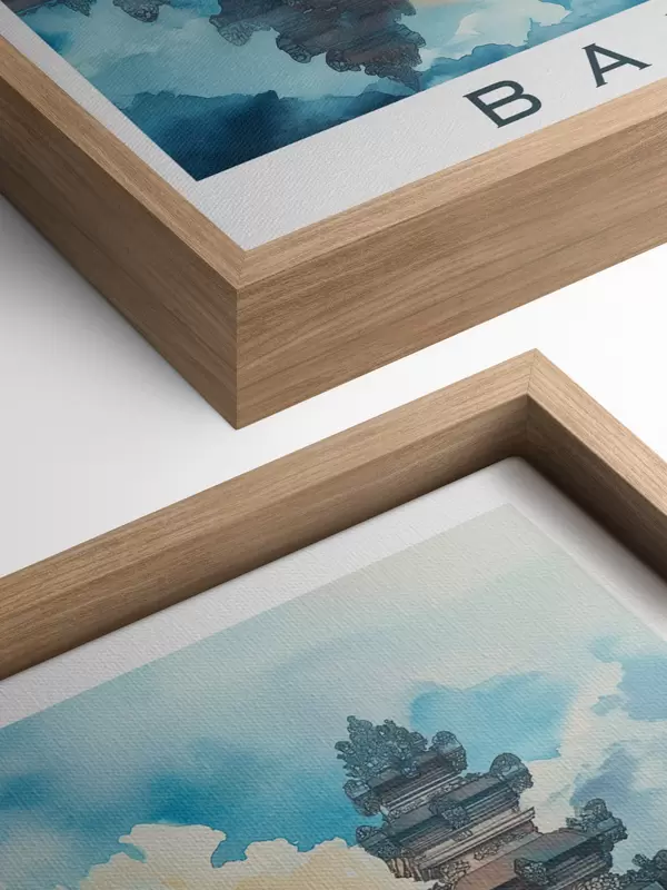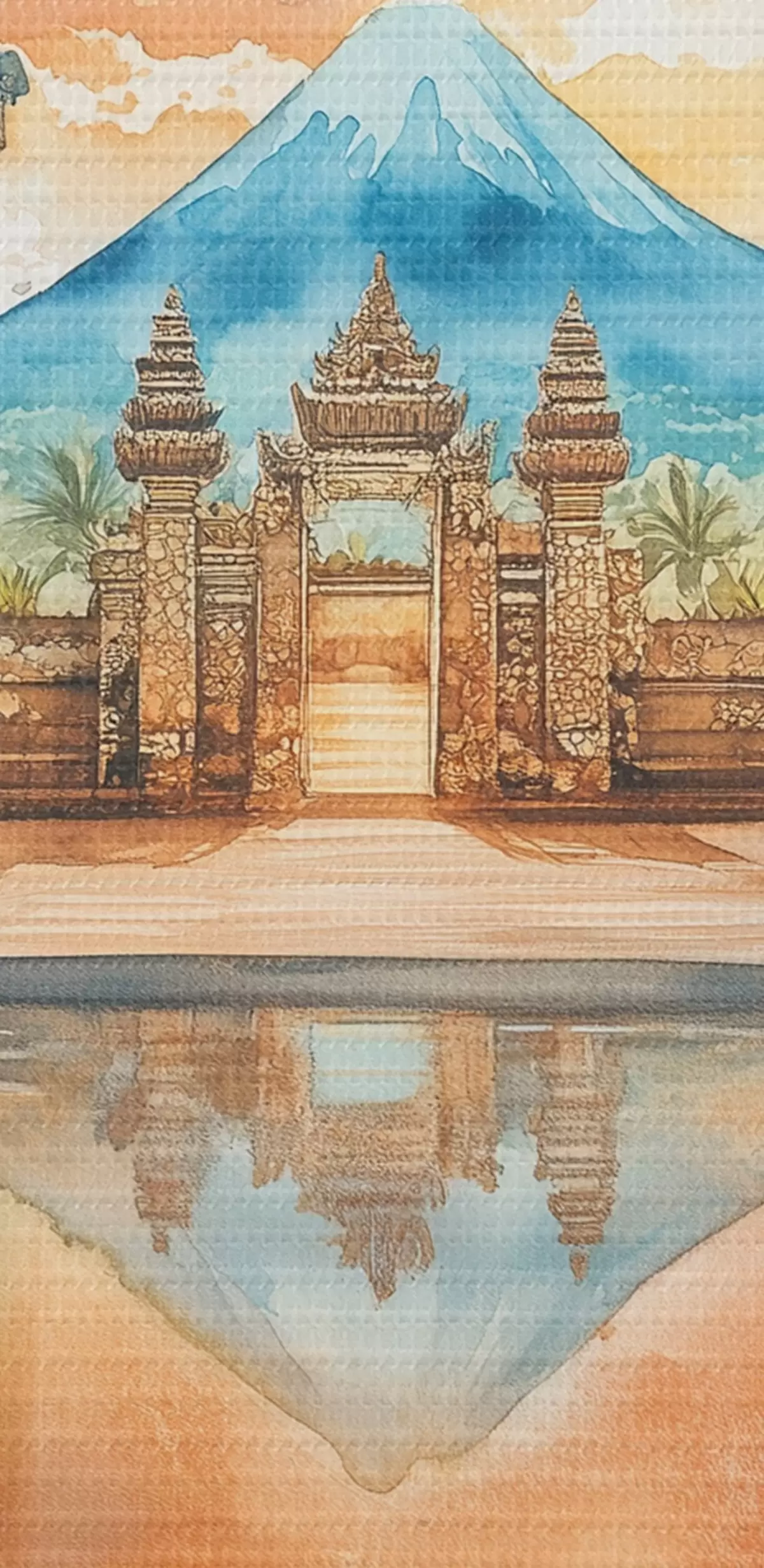 Maalid Bali esteetika, tempel, päikeseloojangu taevas, troopiline loodus, akvarellstiil Nr s44149