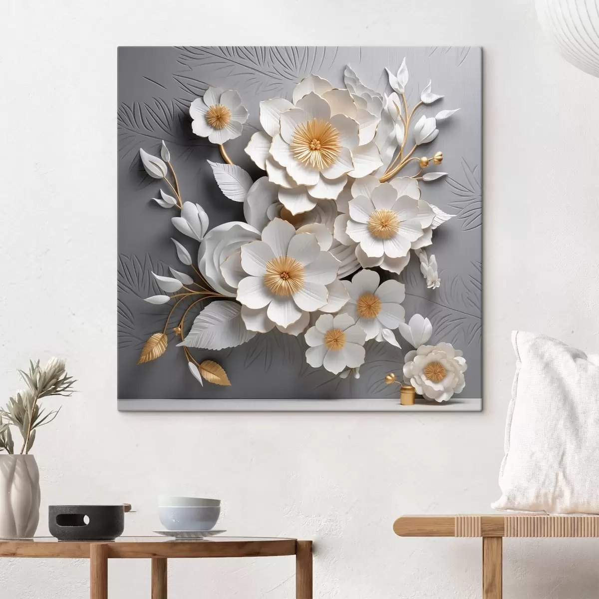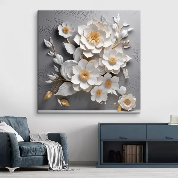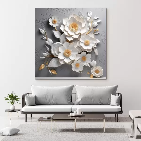 Maalid Volüümikad valged lilled hallil taustal 3D stiilis Nr s44253