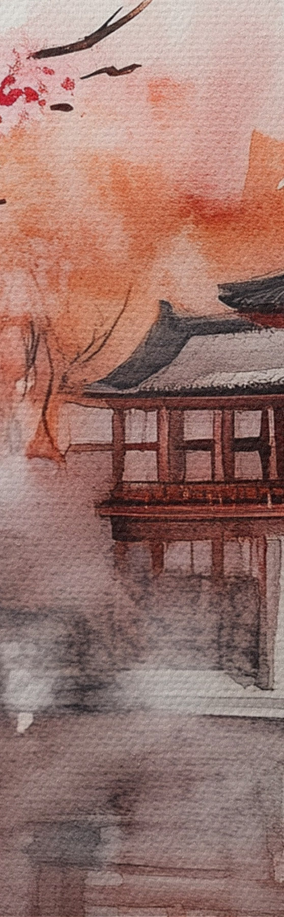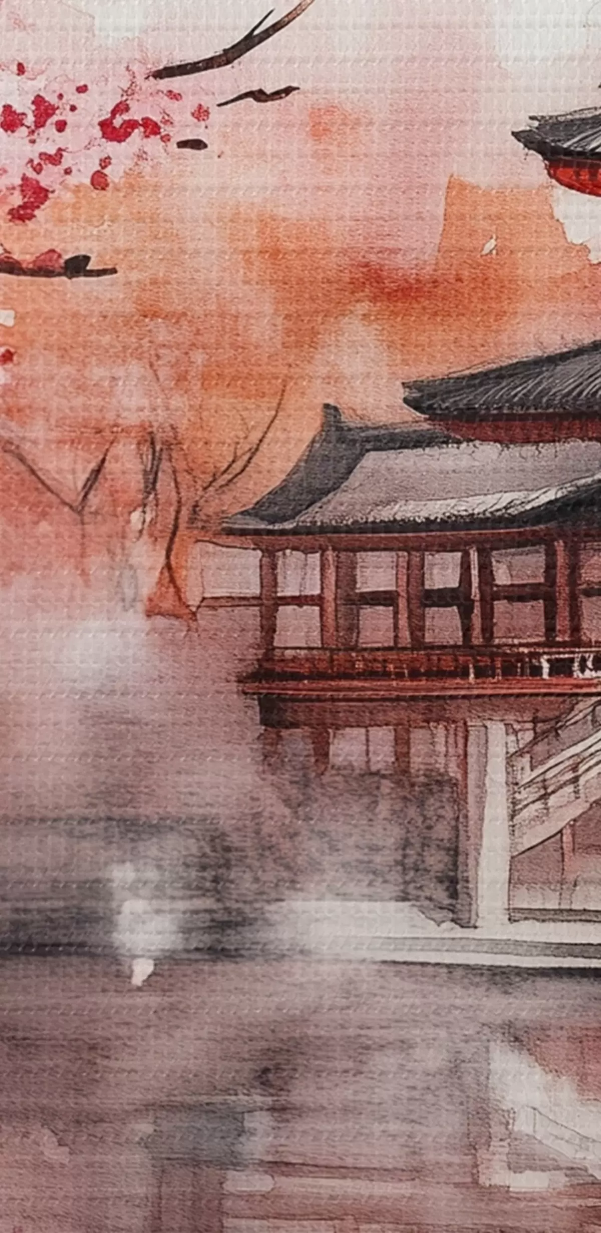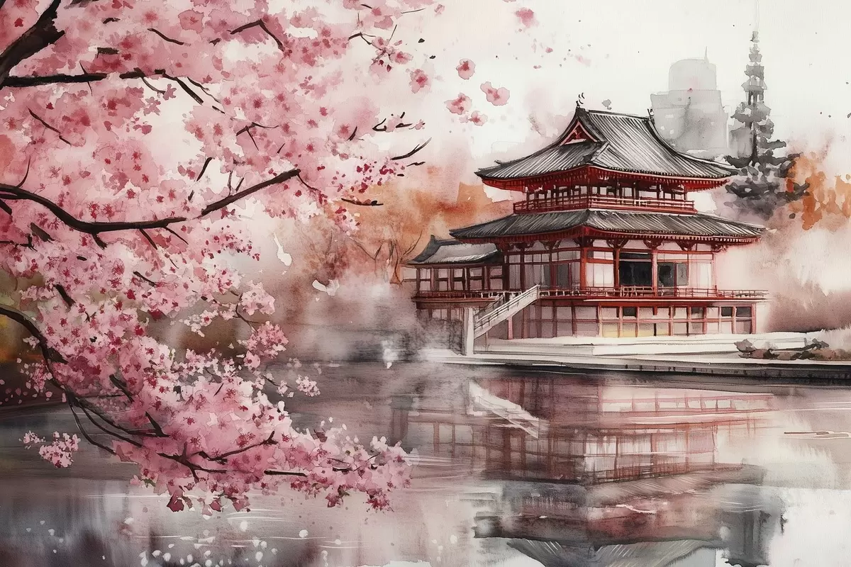 Maalid Kaunis Jaapani maastik koos õitsva kirsipuu ja majaga järve ääres Nr s44310