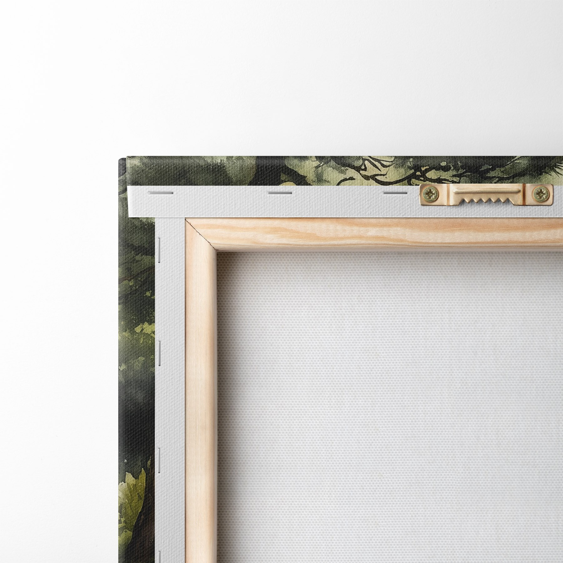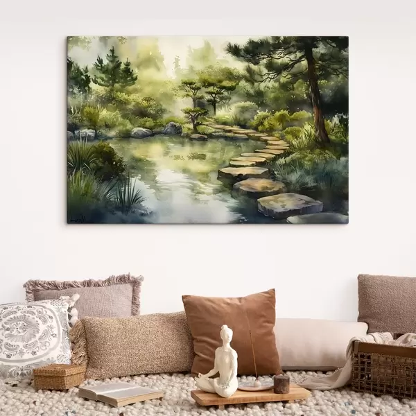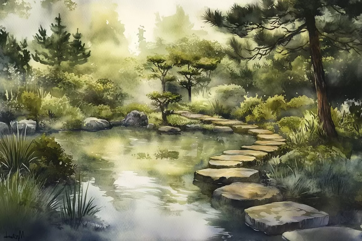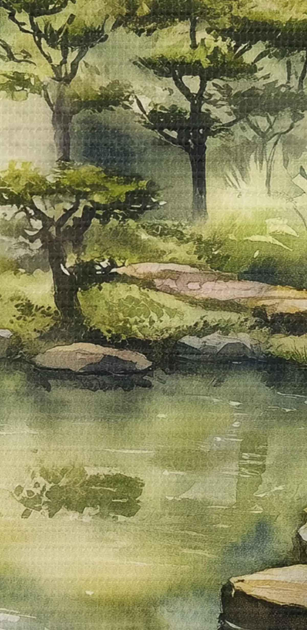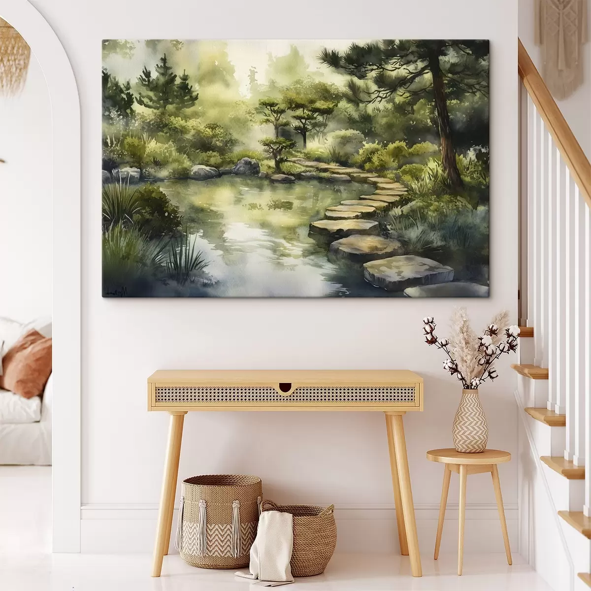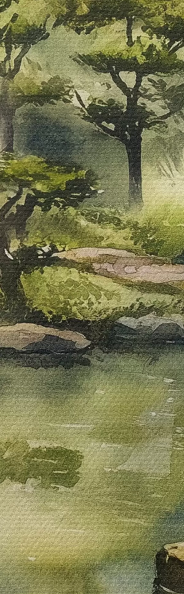 Maalid Idamaine mets koos kivide, tiigi ja mändidega, rohelus, akvarellstiilis Nr s44311