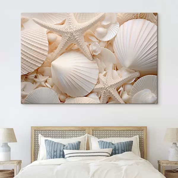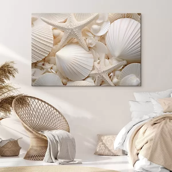 Maalid Dekoratiivsed valged merekarbid ja meritähed, mis loovad tekstuurse ühevärvilise kompositsiooni Nr s44392