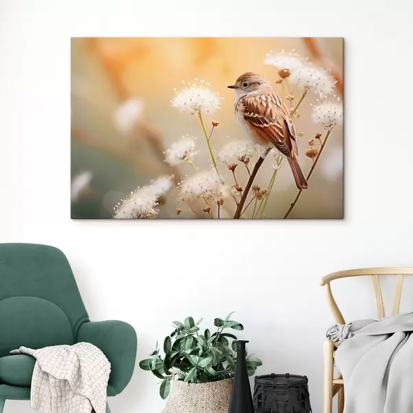 Maalid Linnuke istub valge lillega oksa peal, pehme fookus, loodusfoonil Nr s44393