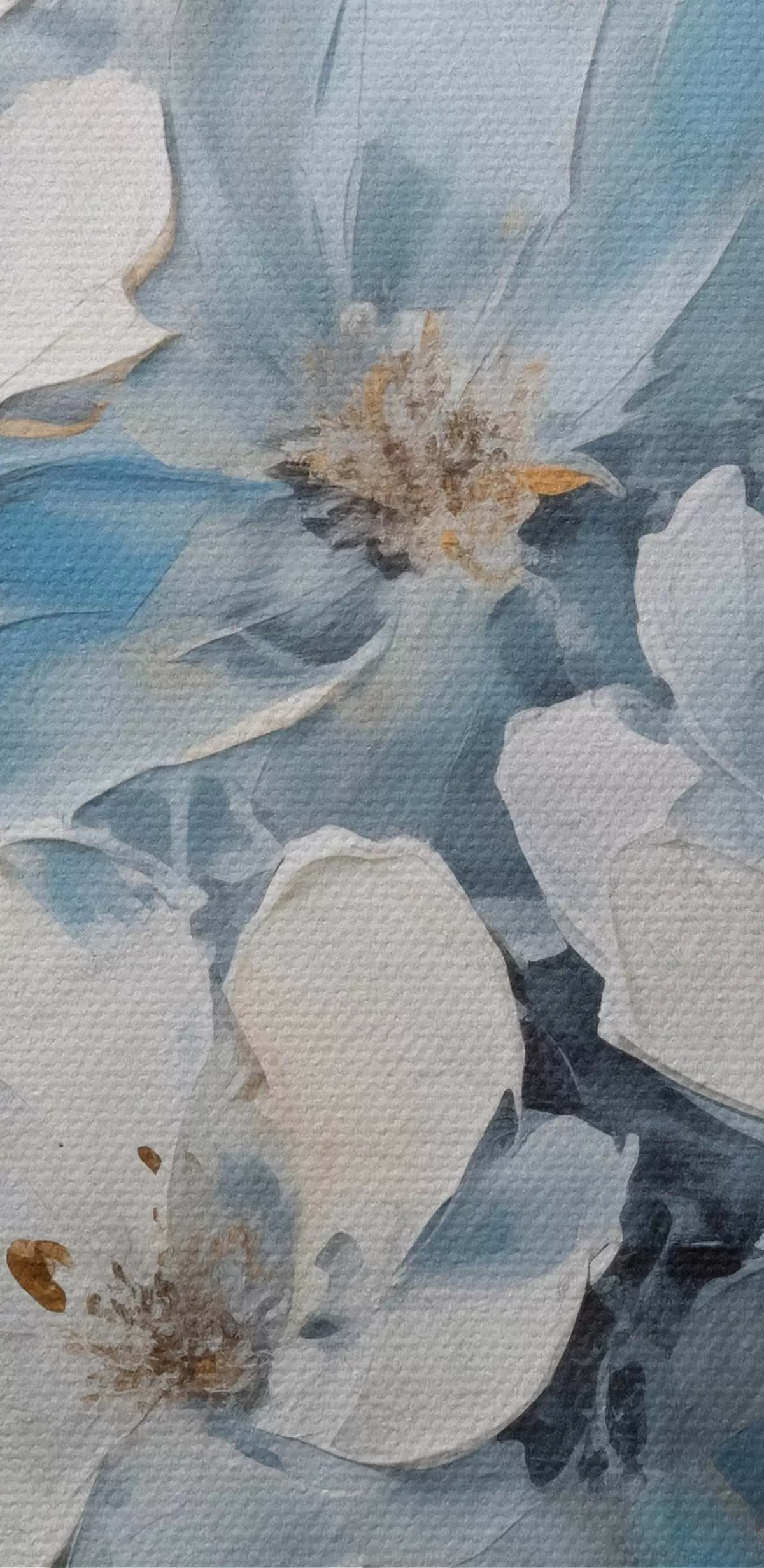 Maalid Valged lilled siniste lehtedega, helebeežil taustal, nähtavate pintslitõmmetega Nr s44395