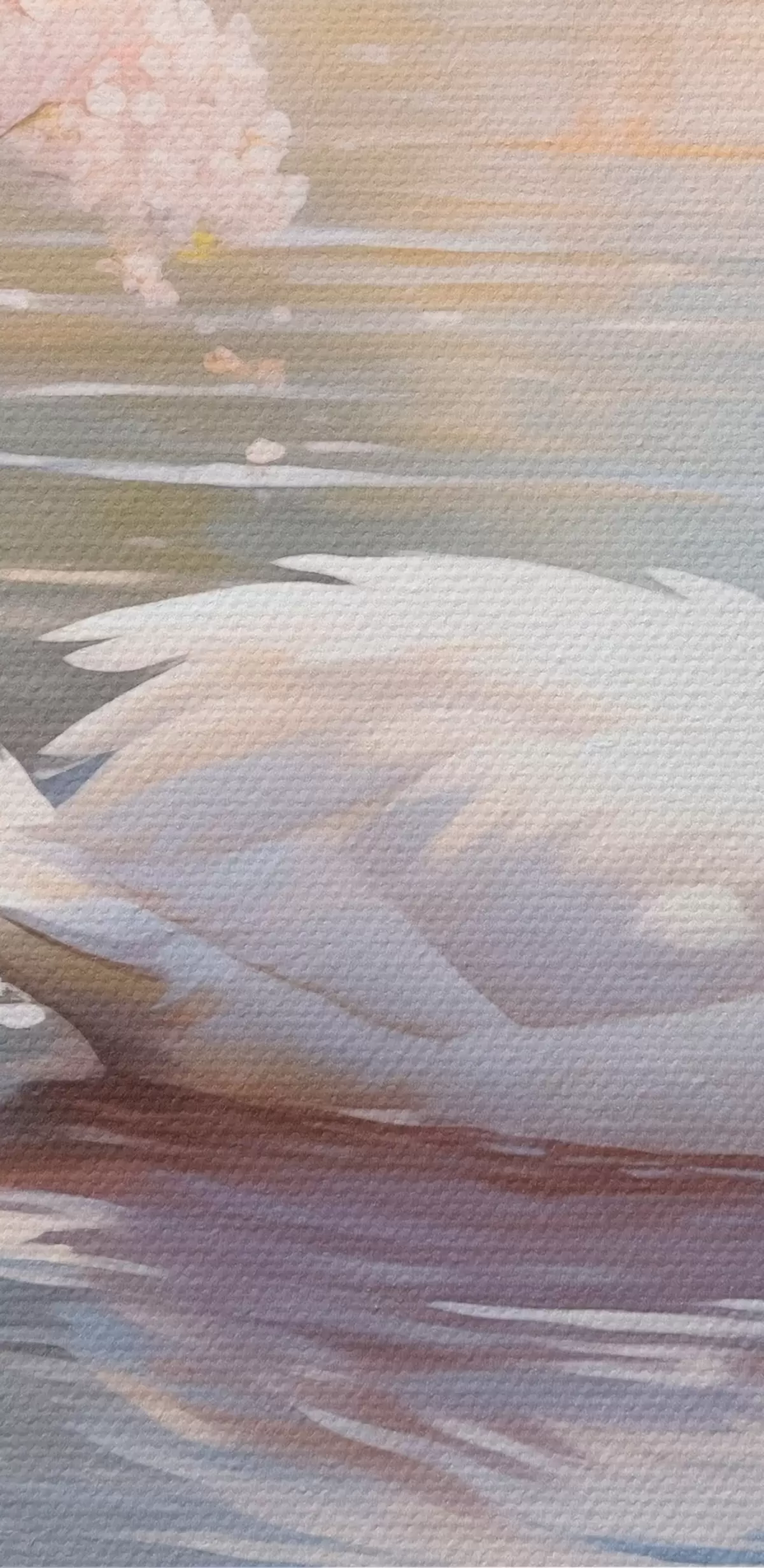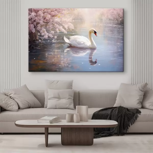 Maalid Valge luik, kes ujub kirsiõiepuudega järves, pastelsed värvid Nr s44396