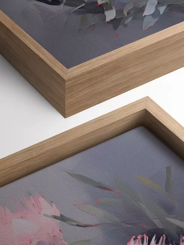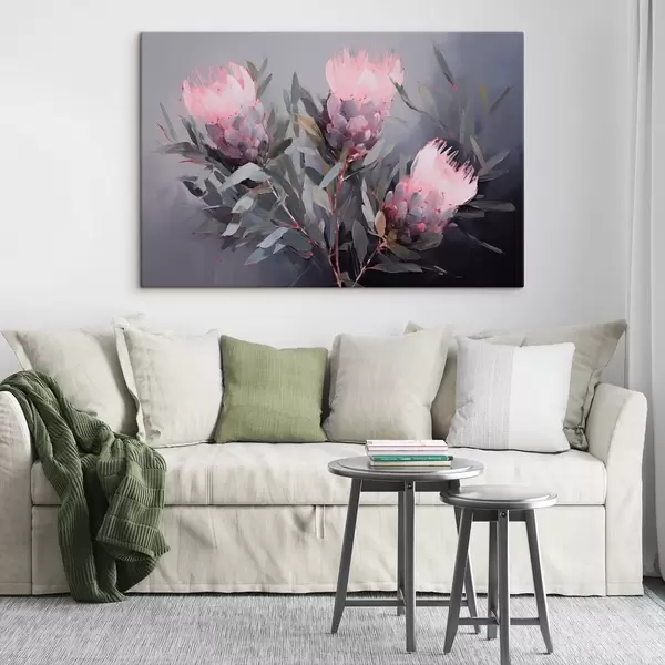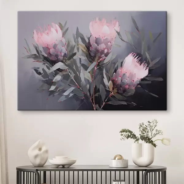 Maalid Roosa protea lilled roheliste lehtedega, pehmed pintslitõmbed, tumedad värvid, elegantne kompositsioon Nr s44400