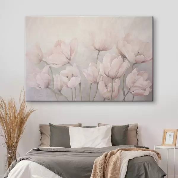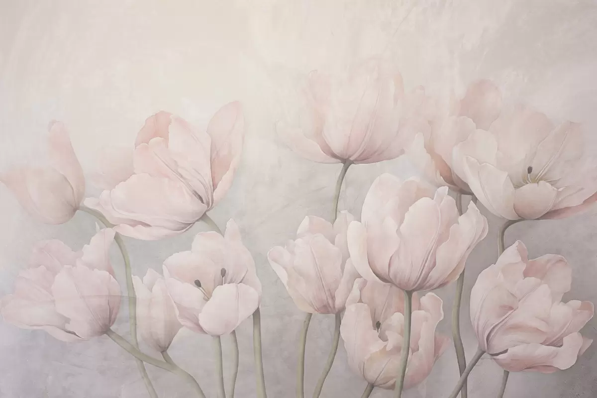 Maalid Vintage tekstuuriga roosad tulbid pikkade varrega, pehmed summutatud värvid, helehall taustaga Nr s44407