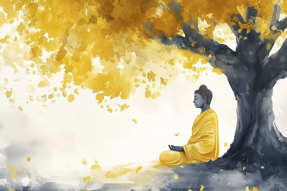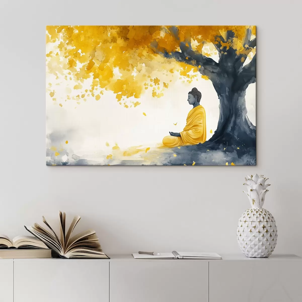 Maalid Mediteeriv Buddha puu all, kollased ja hallid värvid Nr s44509
