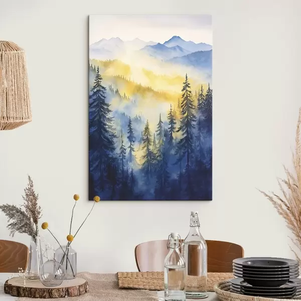 Maalid Udusad mäed päikesetõusul, mändide esised, sinised ja kollased värvid Nr s44602