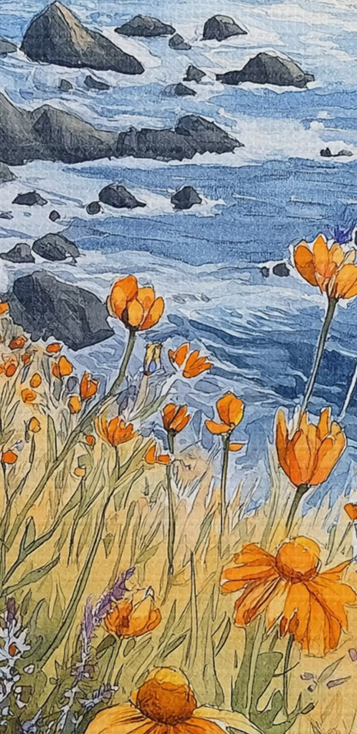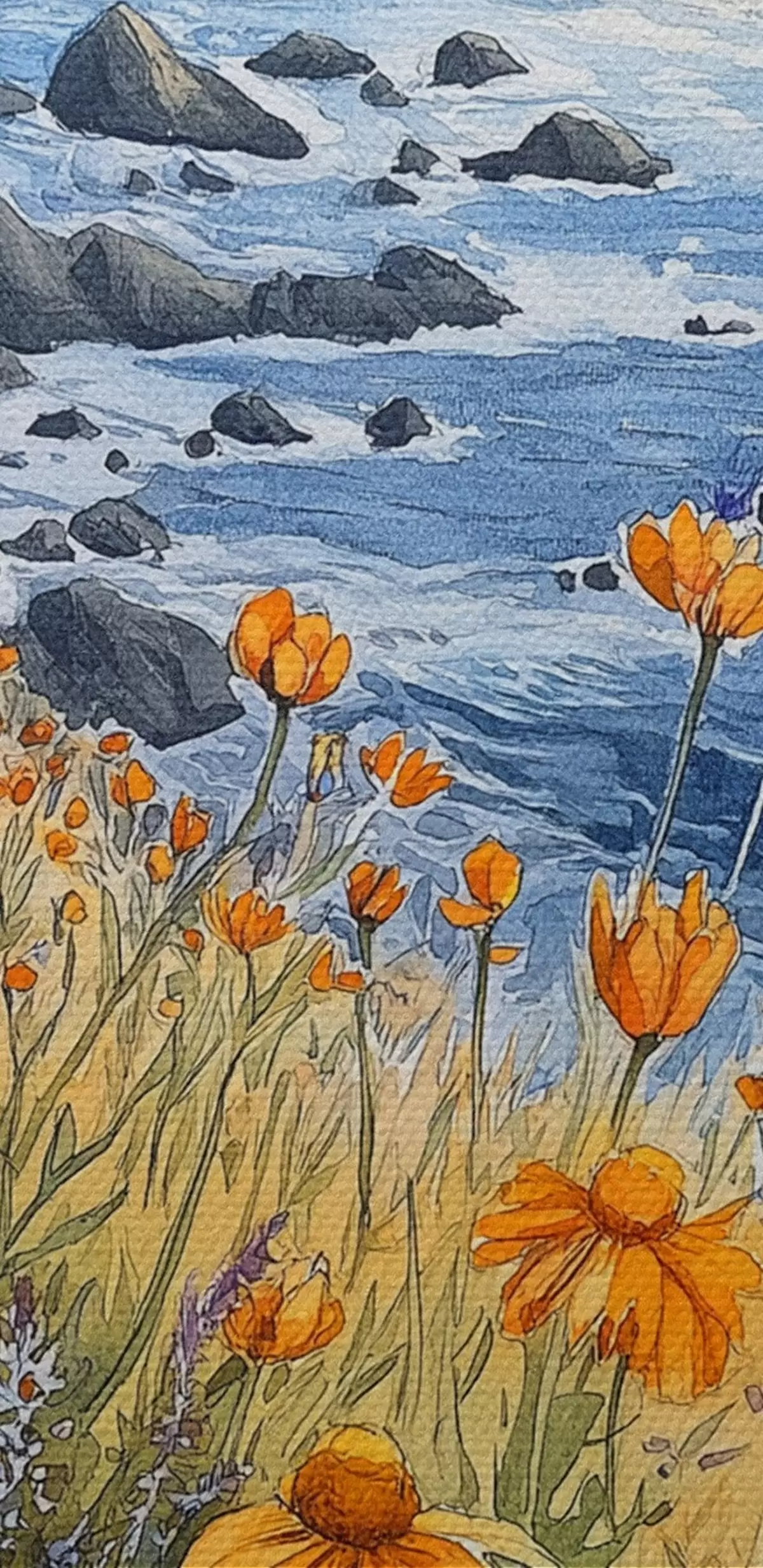 Maalid Kalju oranžide lilledega, ookeanirannik, Portugal, akvarellstiil Nr s44604