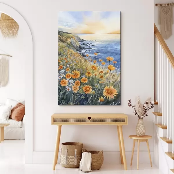 Maalid Kalju oranžide lilledega, ookeanirannik, Portugal, akvarellstiil Nr s44604