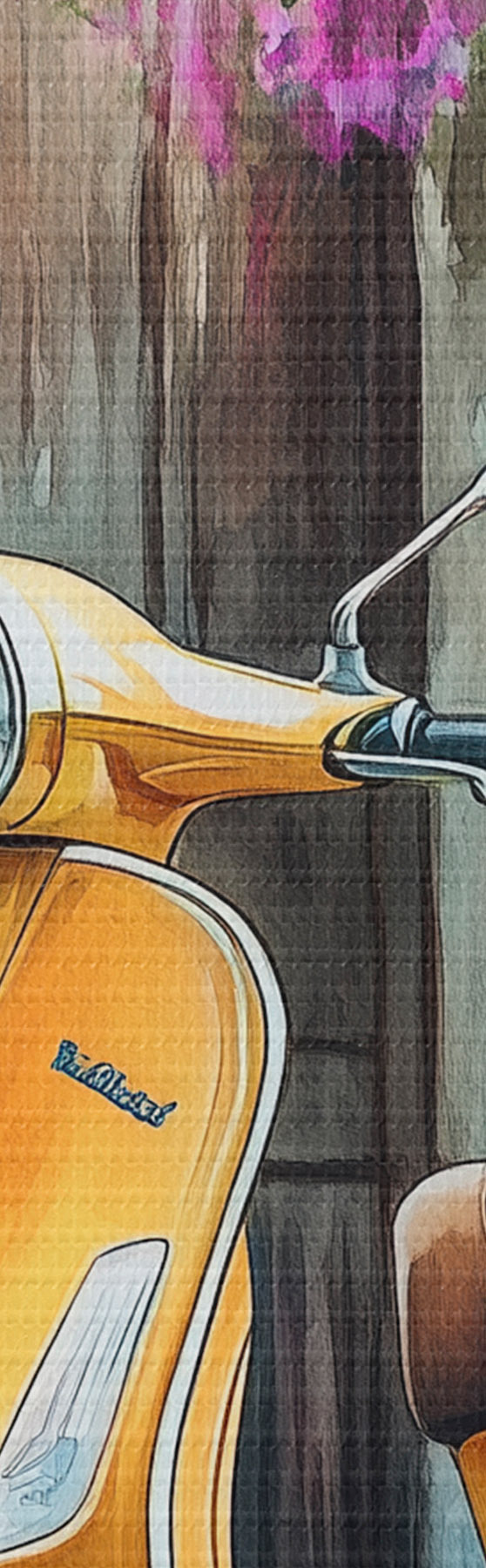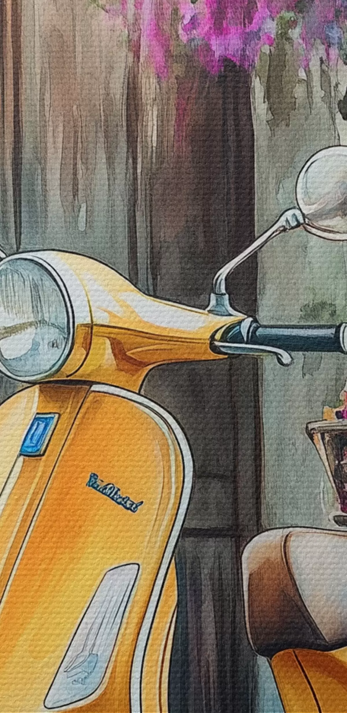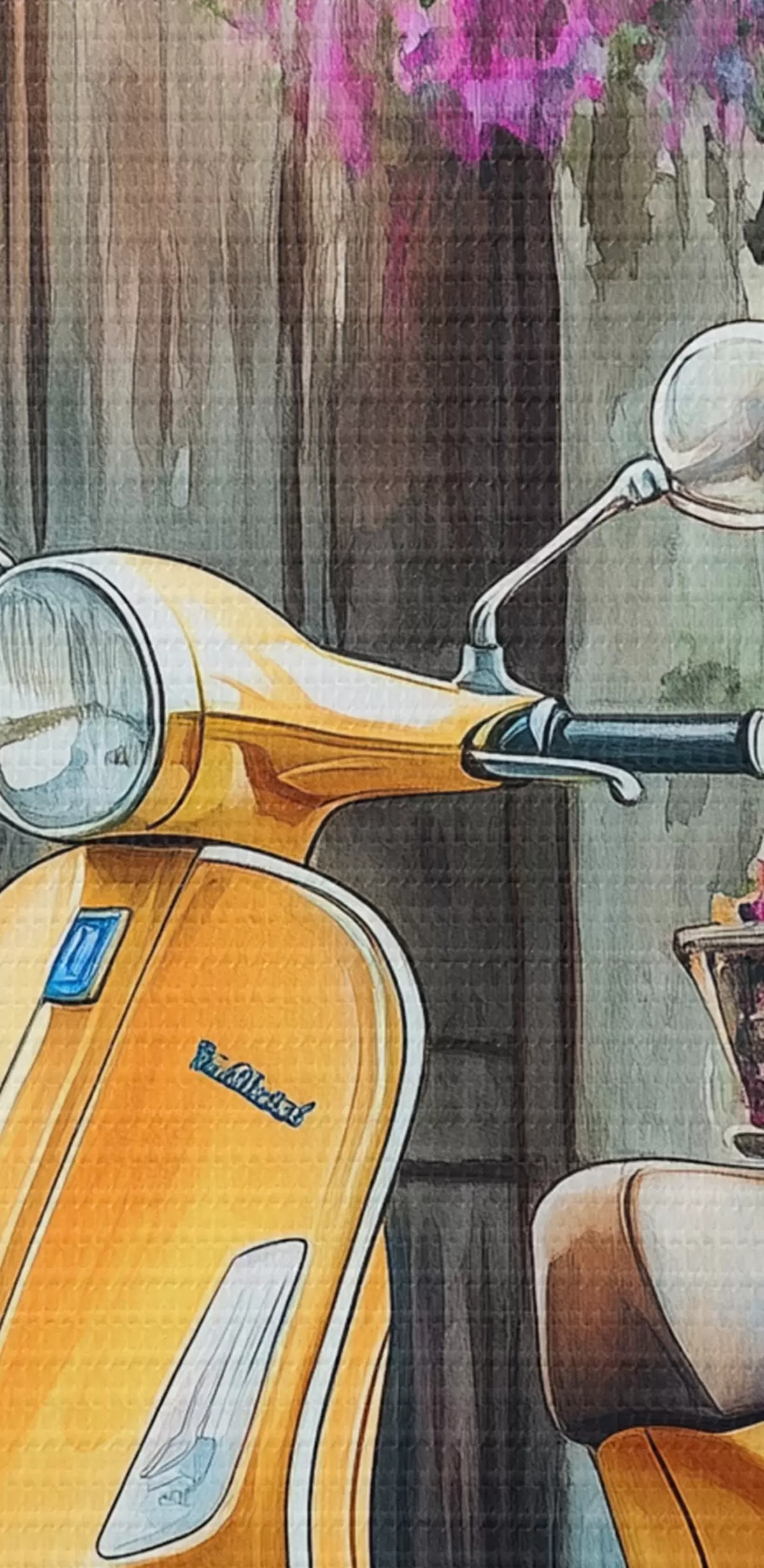 Maalid Kollane Vespa roller lilledega puidust ukse juures Nr s44607