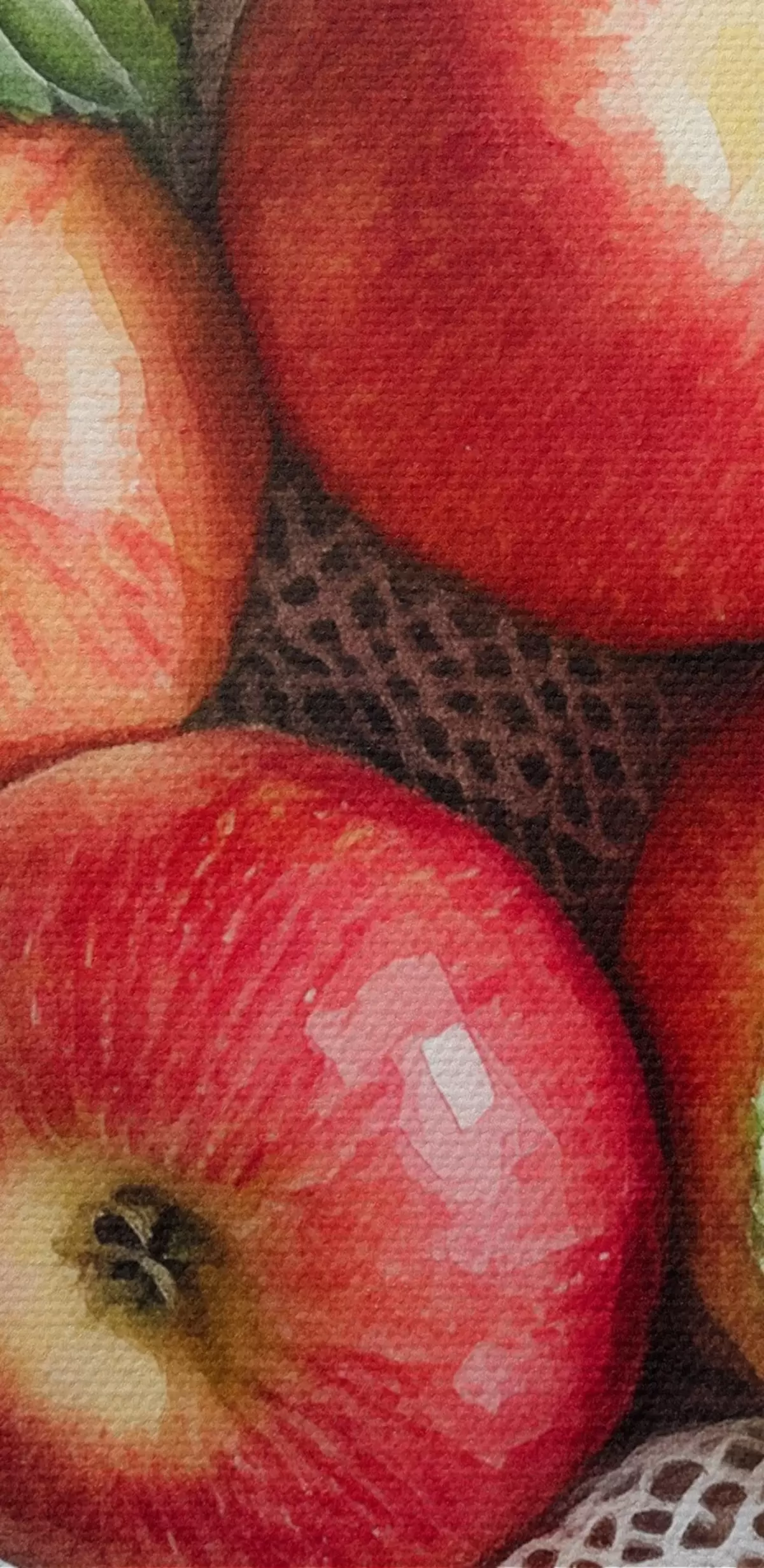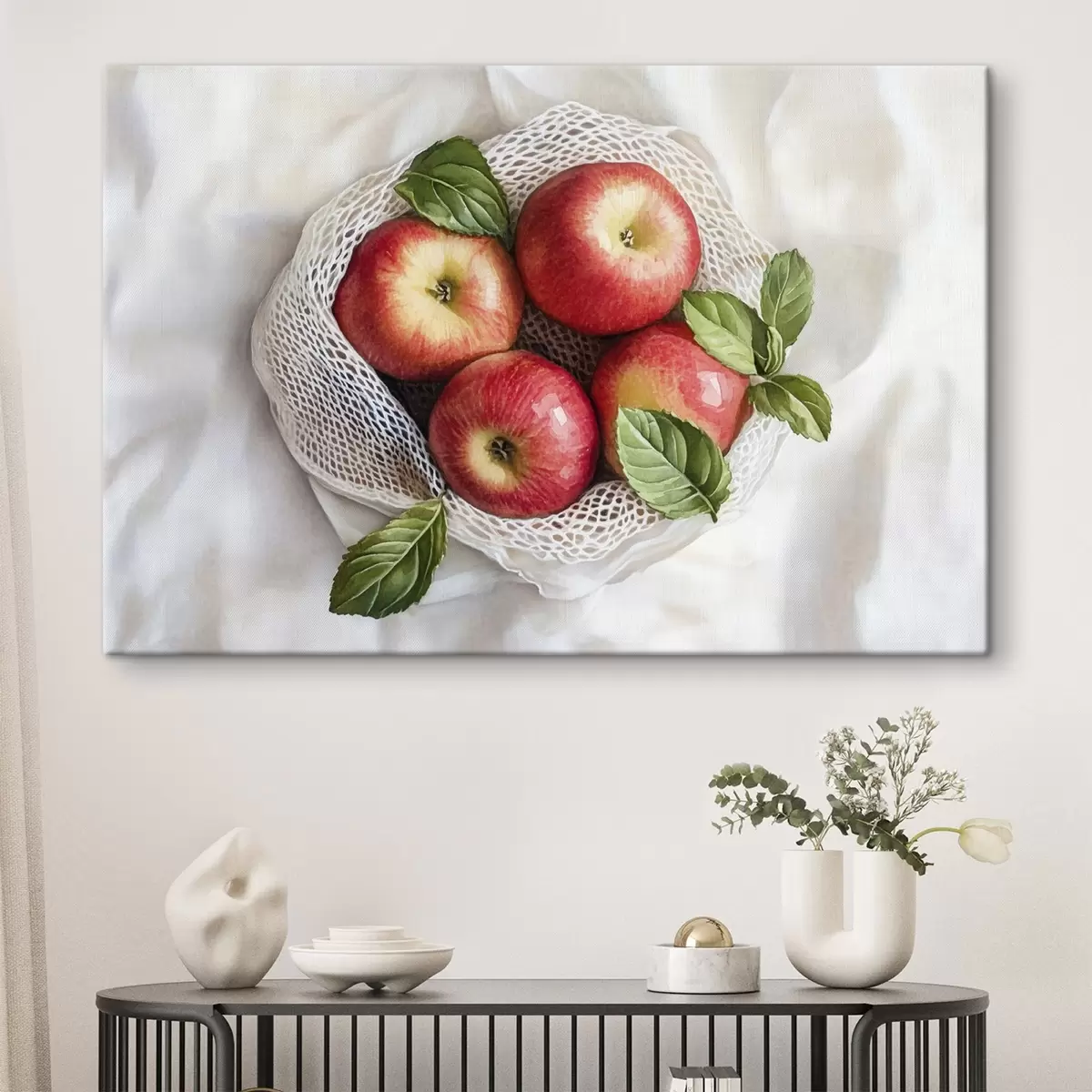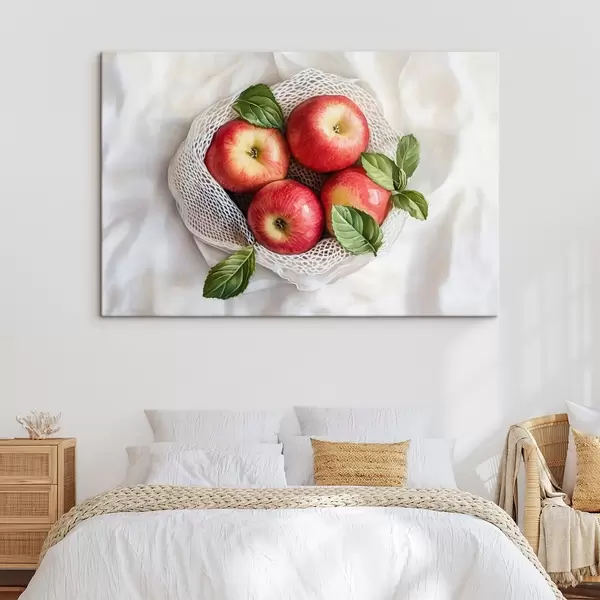 Maalid Punased õunad linasest kotist piparmündilehtedega, maalähedane stiil, puuviljad Nr s44609