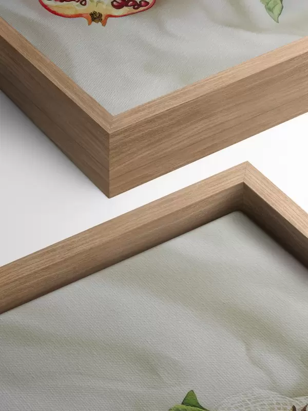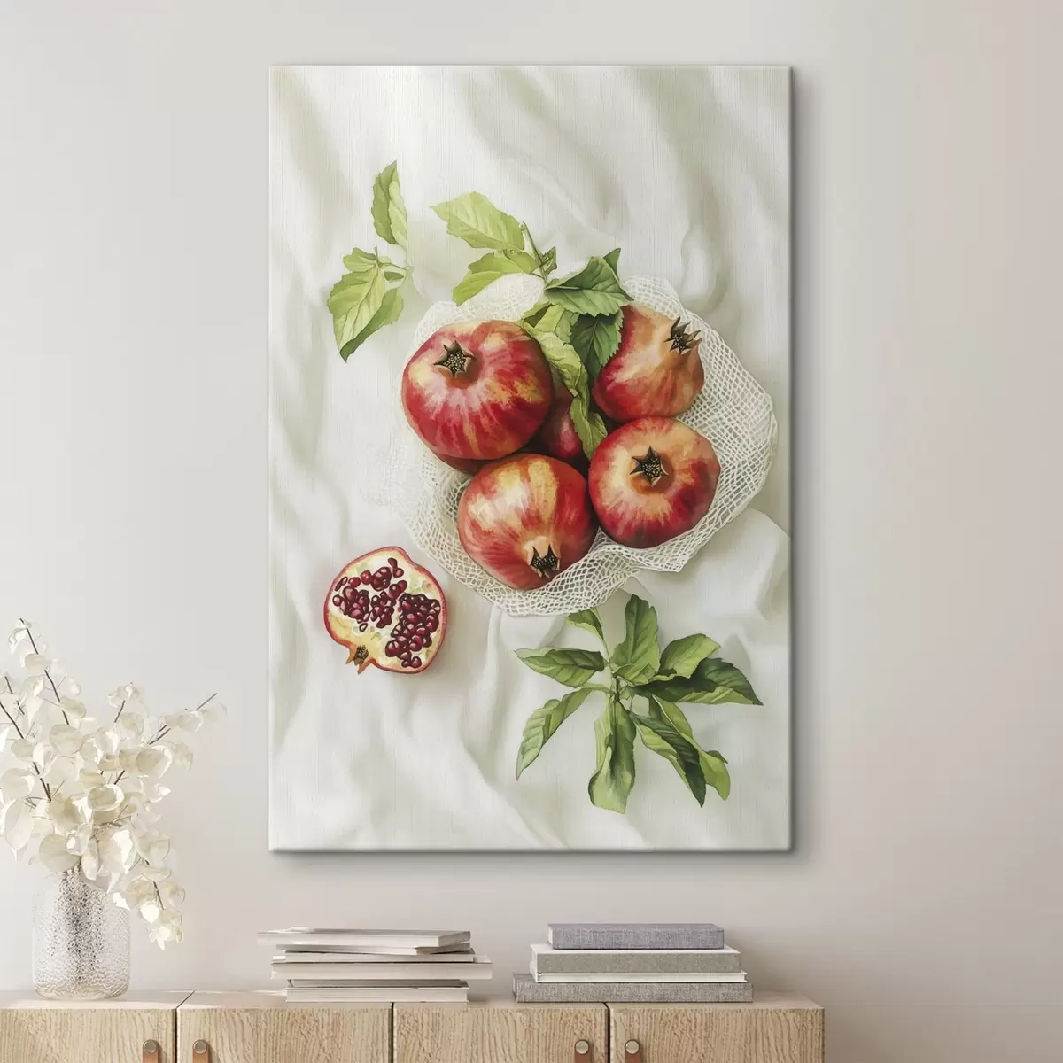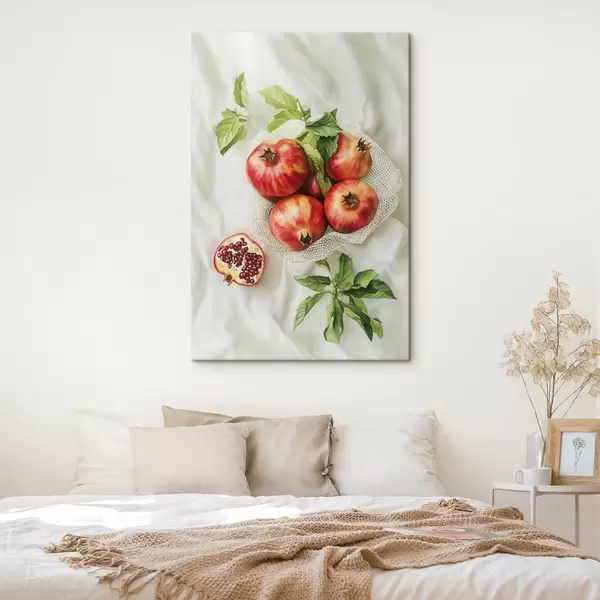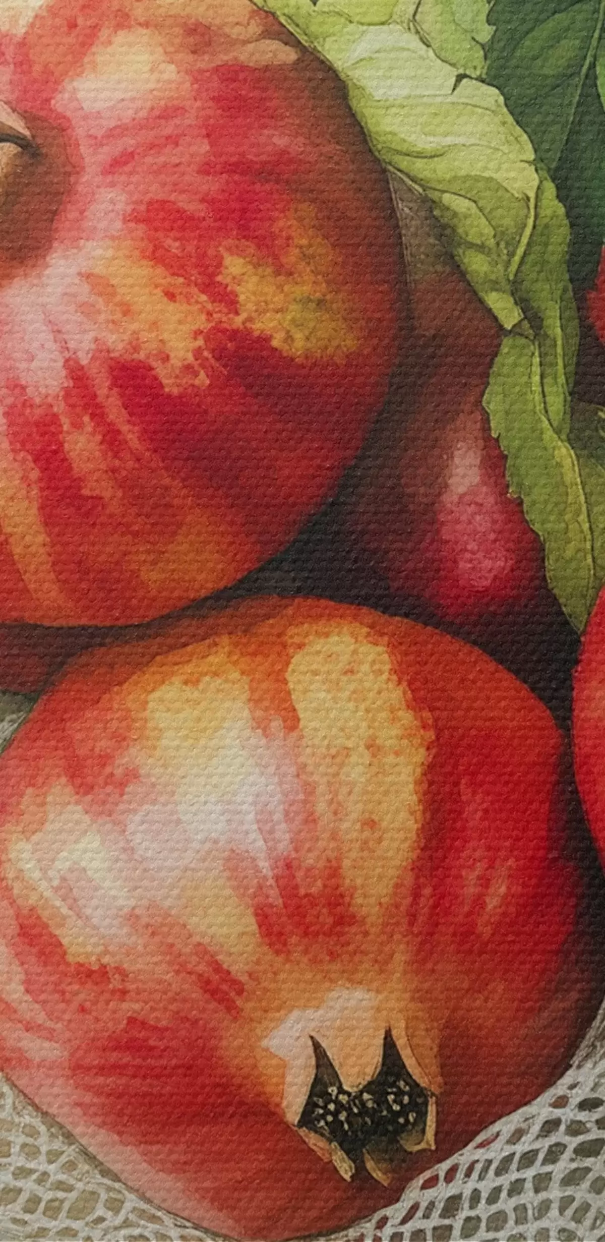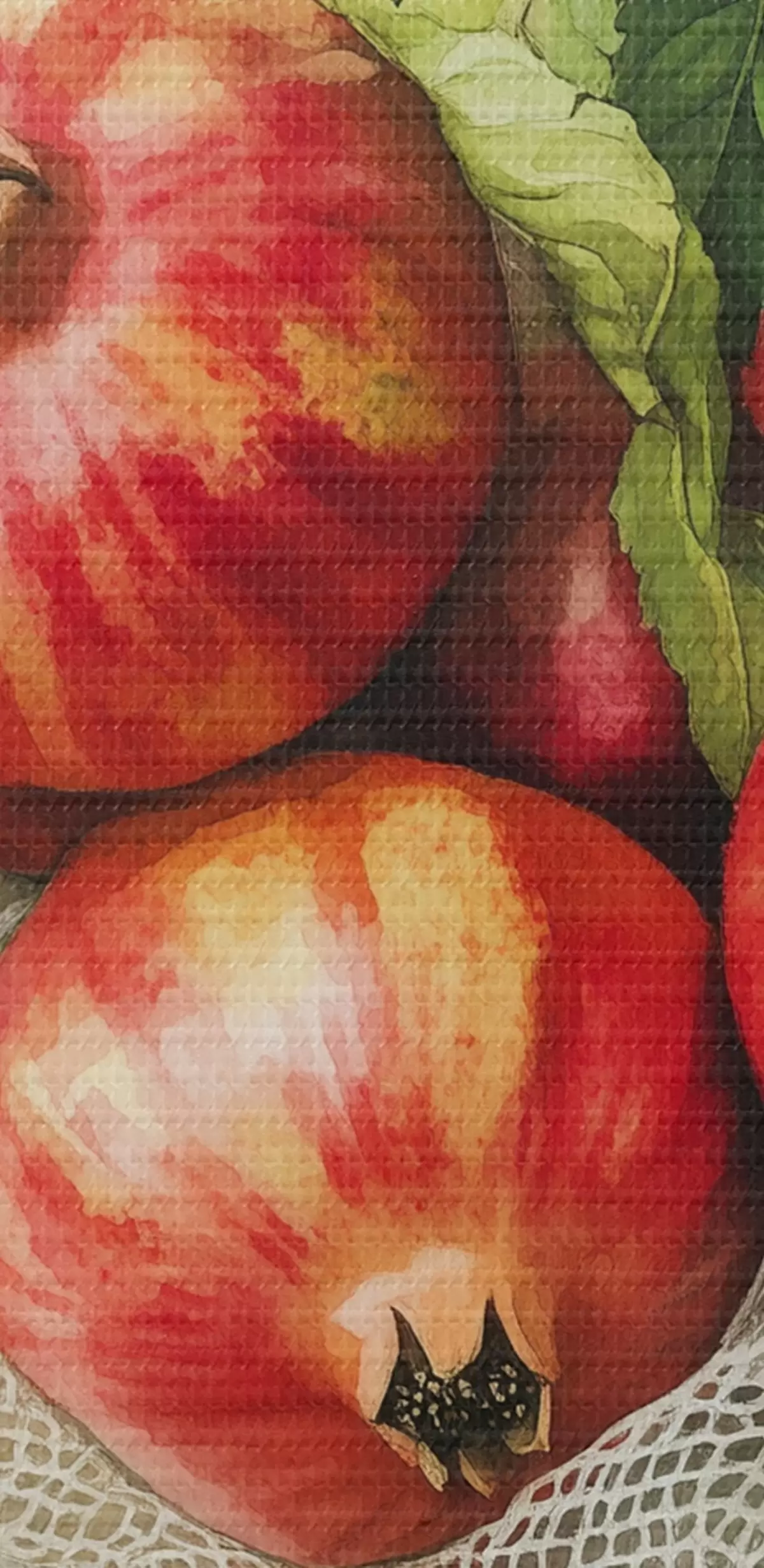 Maalid Granaatõunad piparmündilehtedega linasest laudlinast, rustikaalne stiil Nr s44611