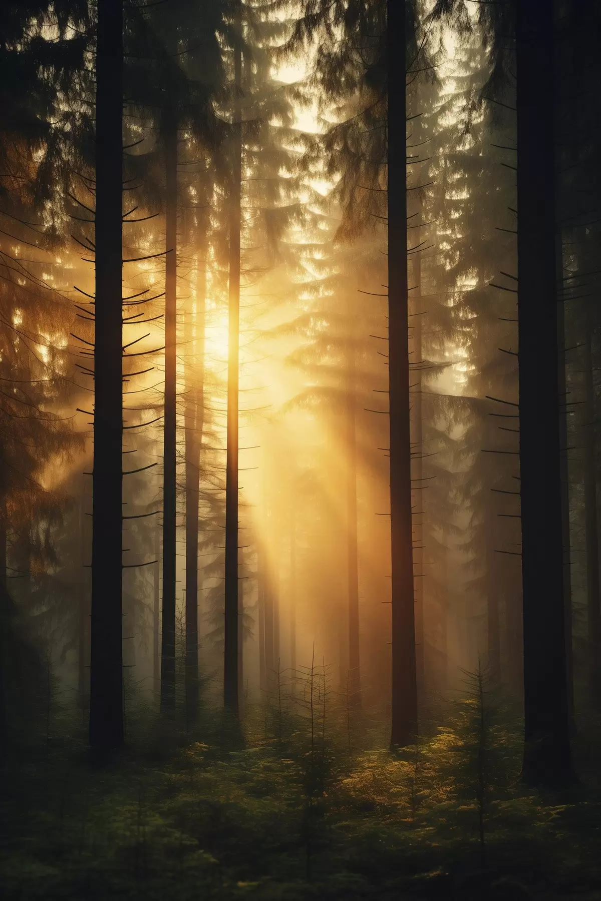 Pilt Tihe männimets koos päikeseloojangu valgusega, realism, loodus s44615