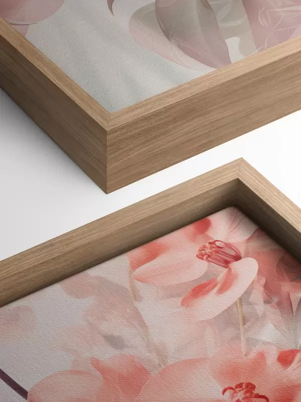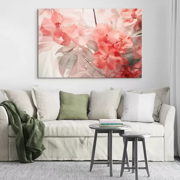Maalid Eredad roosad troopilised lilled koos pehmete, vaoshoitud roheliste lehtedega, mis loovad unenäolise õrna tekstuuri Nr s44861