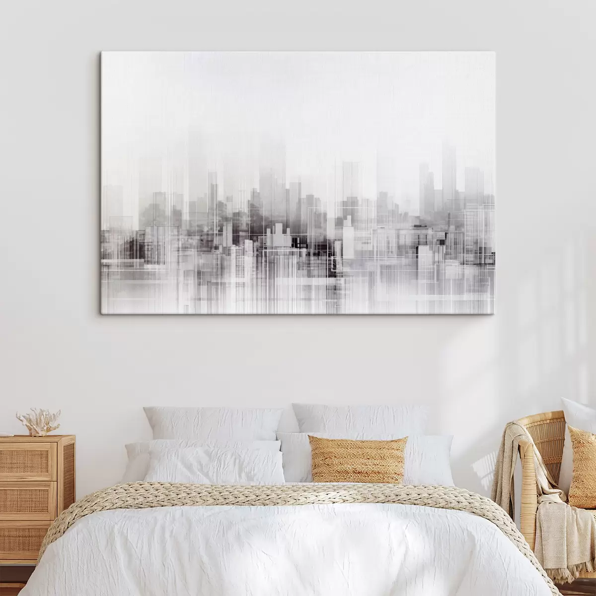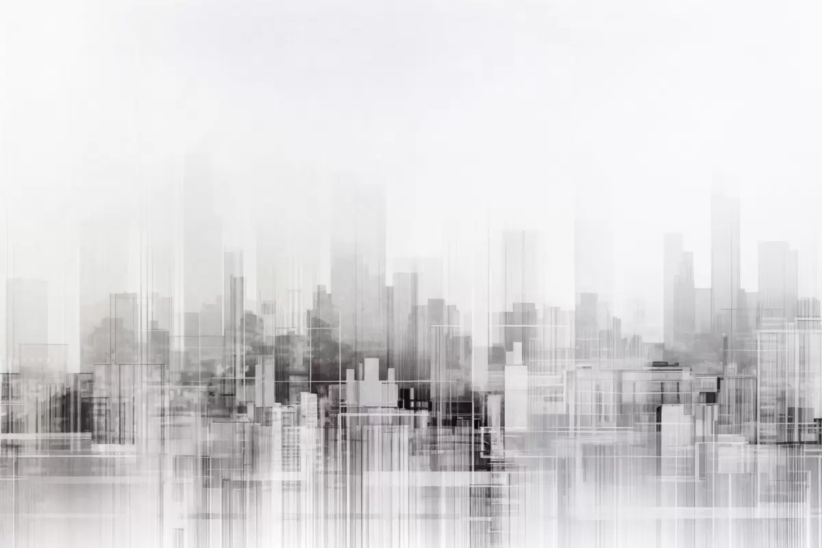 Maalid Tekstuurne minimalistlik linnapilt kõrgete hoonete ja pilvelõhkujatega, siluettidena valge taeva taustal Nr s44863