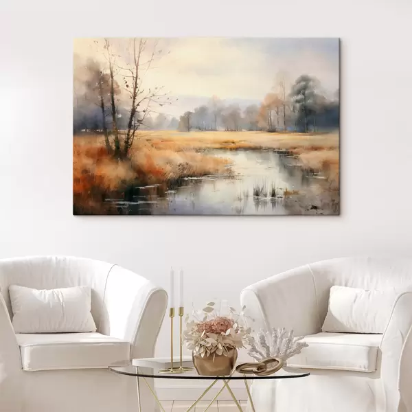 Maalid Rahulik tekstuuriga maastikumaali imitatsioon pilliroost ja paljaste puude, rahuliku vee all taevas Nr s44867