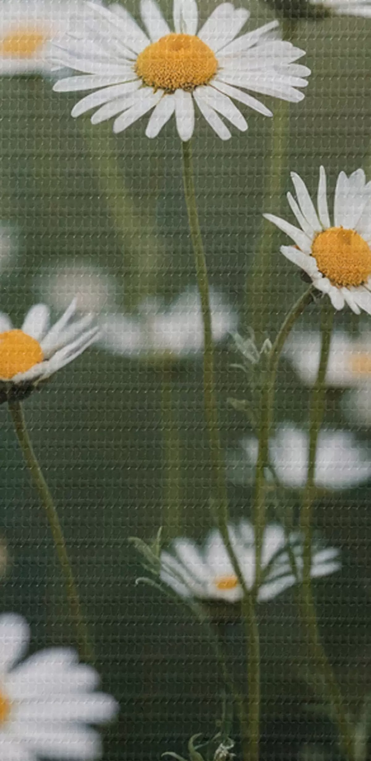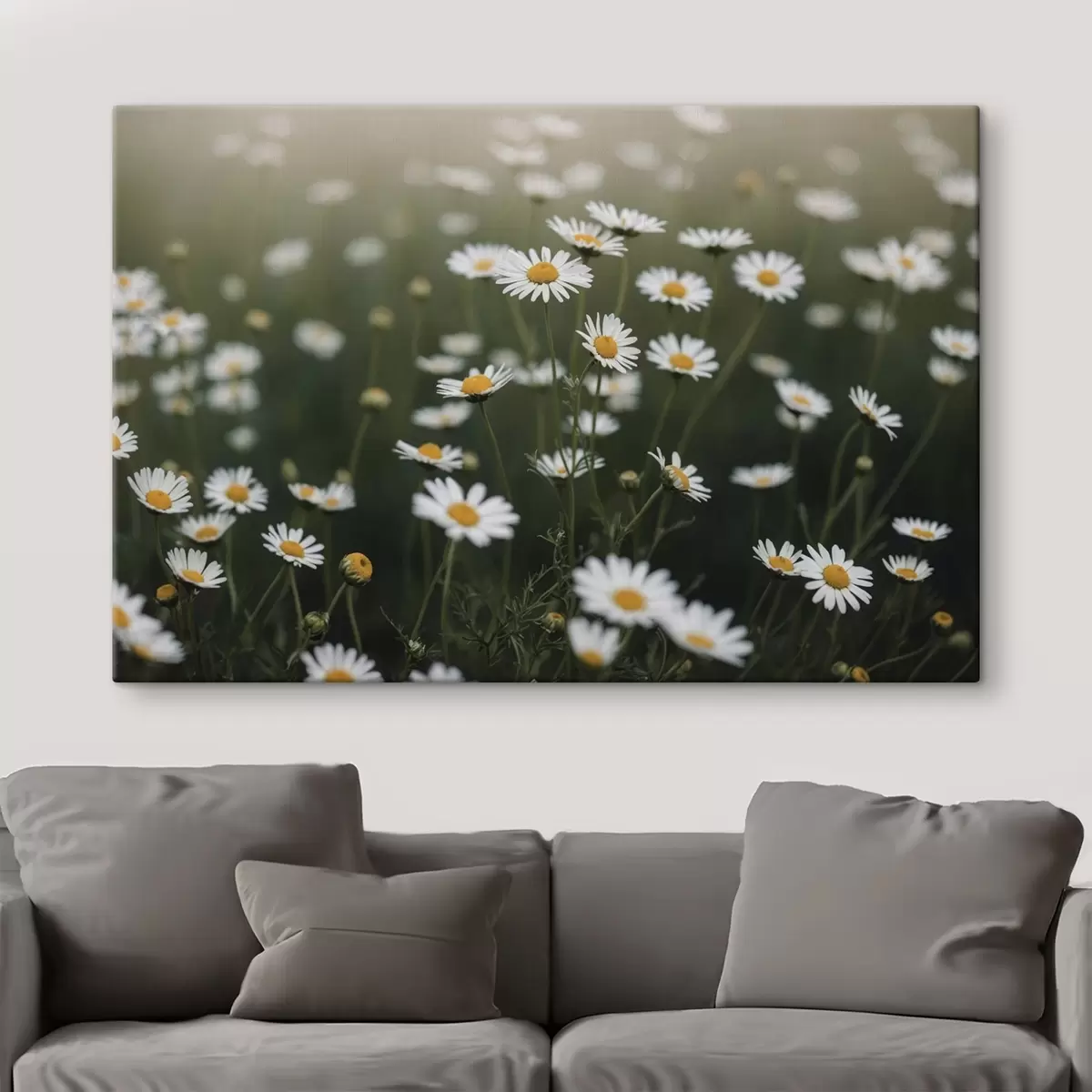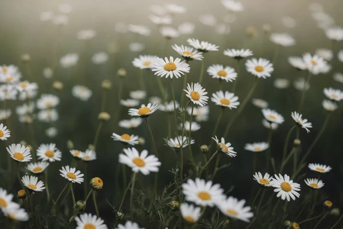 Maalid Daisy väli fookusest väljas rohelise taustaga Nr s44898