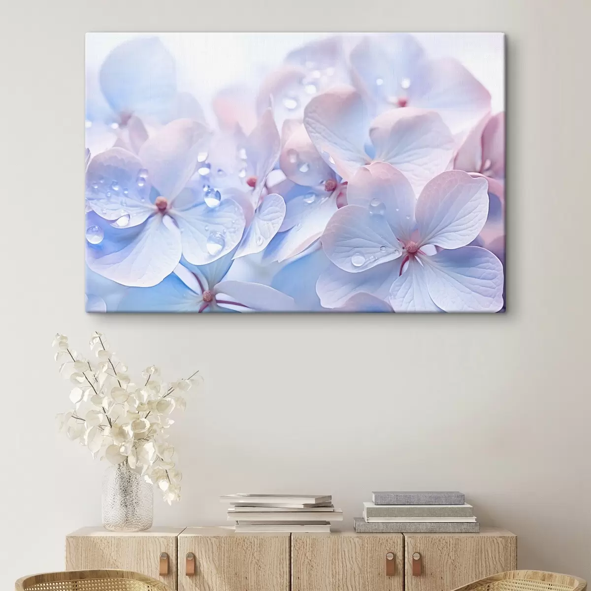 Maalid Hortensialilled veetilkadega õrnadel kroonlehtedel, pehmed pastelsed värvid, helesinised ja roosad toonid Nr s44929