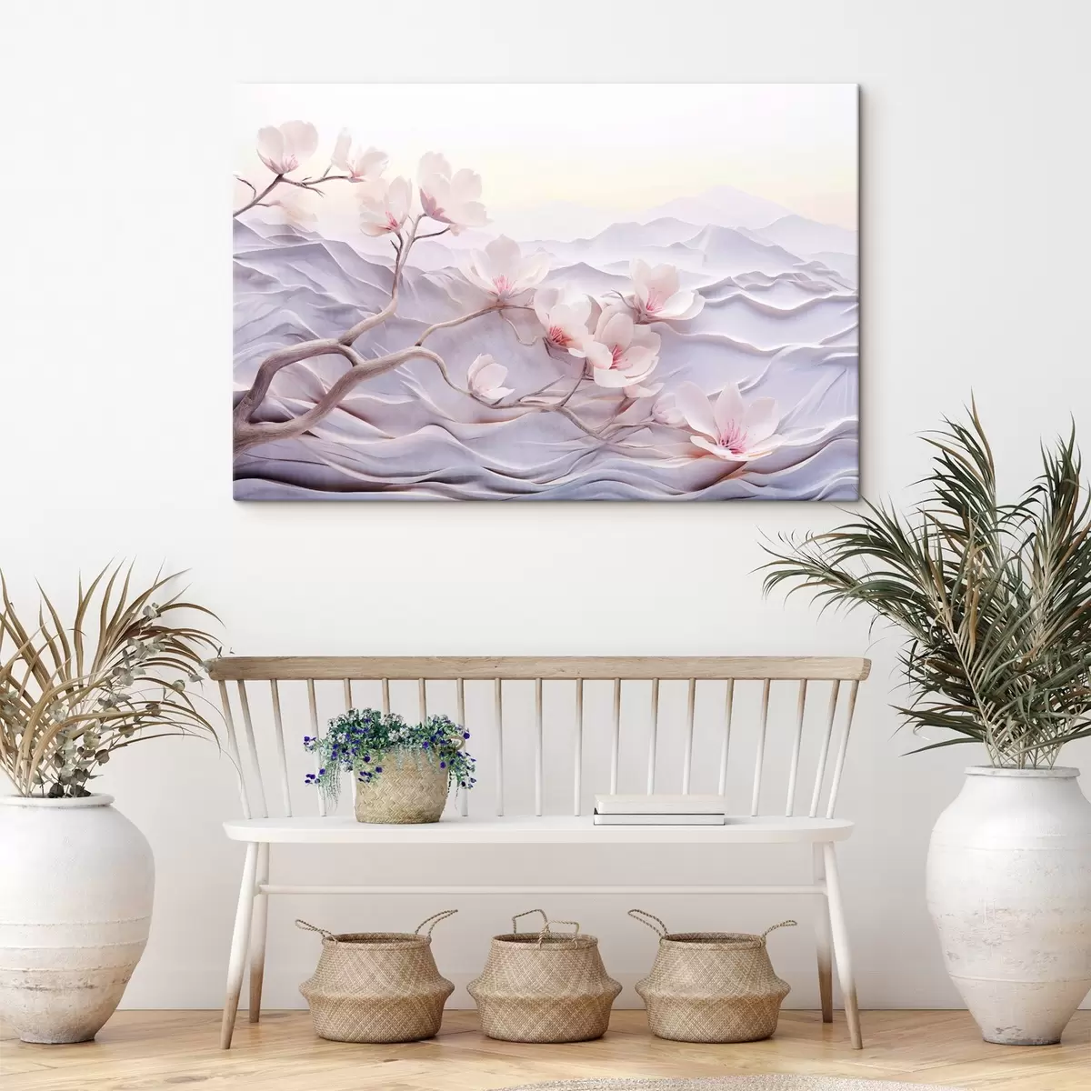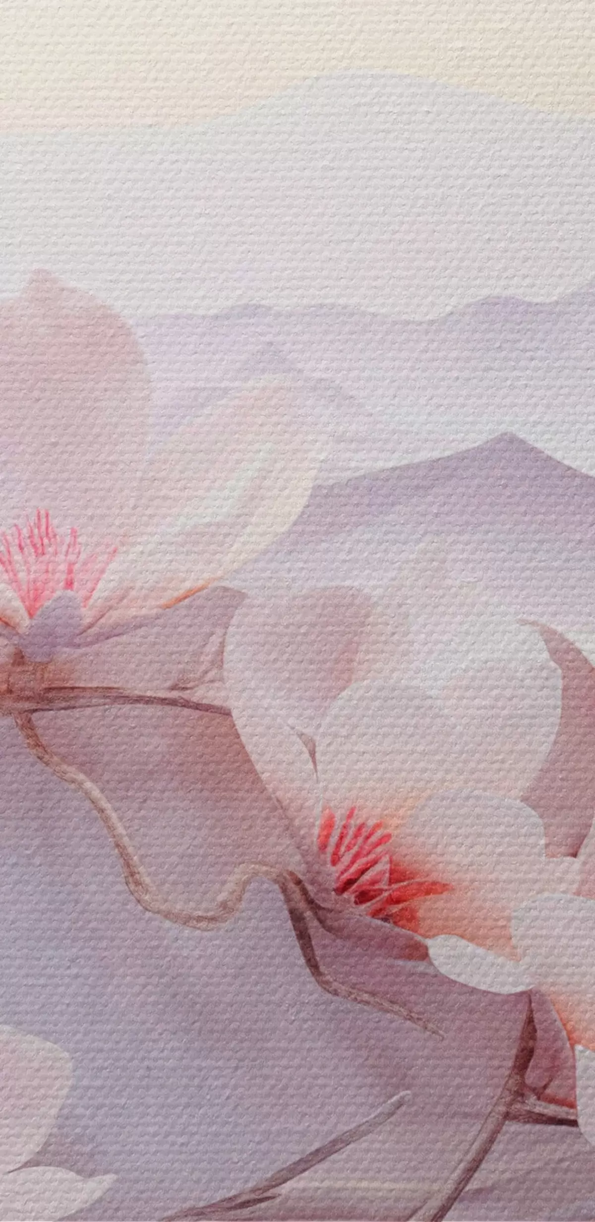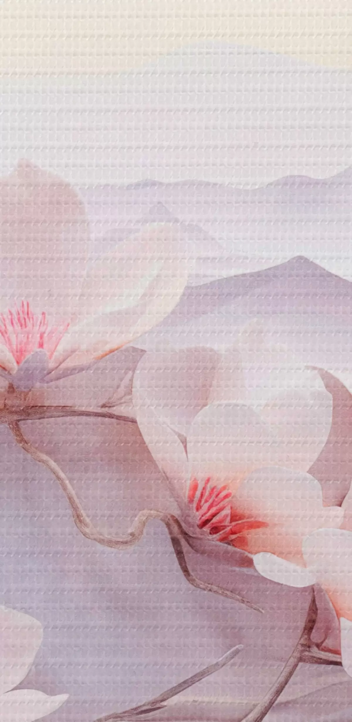 Maalid Roosade lilledega lilleharu, taustal mäed, pehmed pastelsed värvid, jaapani tekstuurne kunst Nr s44930