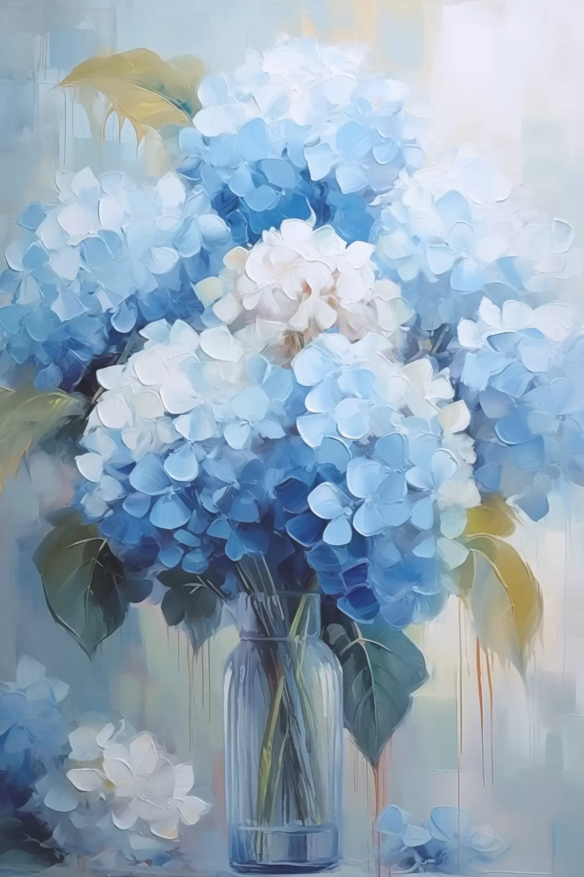 Maalid Sinise hortensiaga kimp klaasvaasis Nr s44998