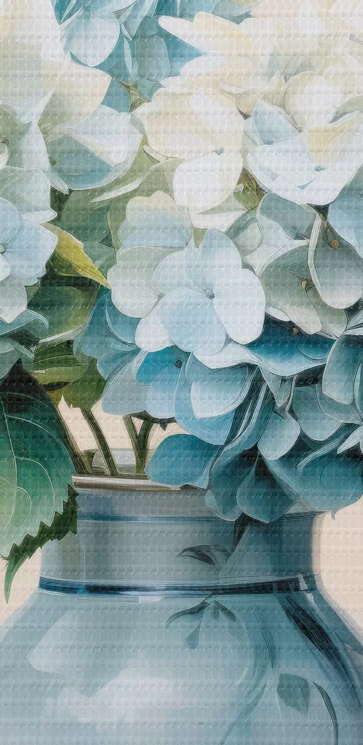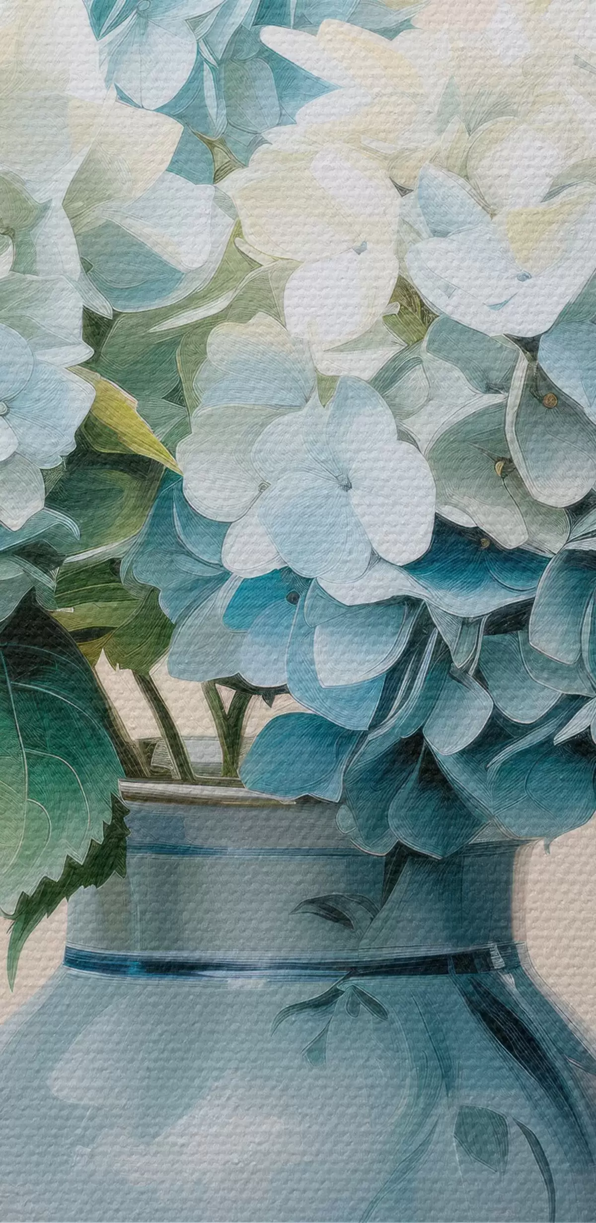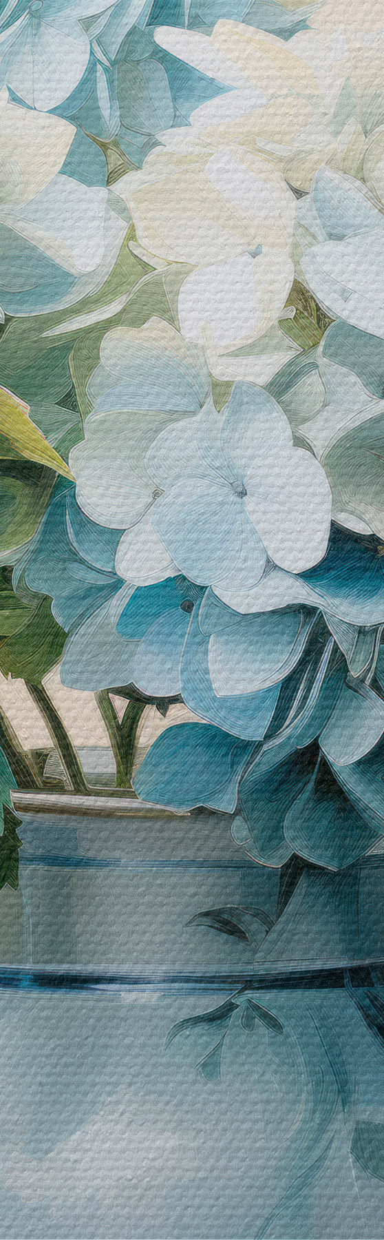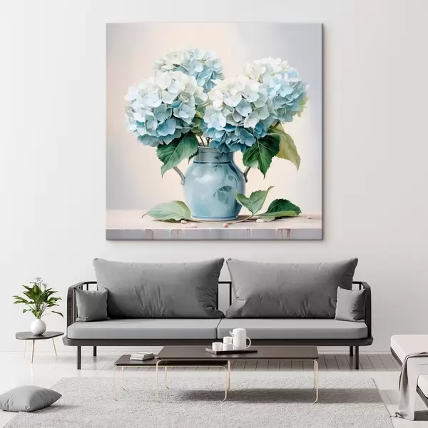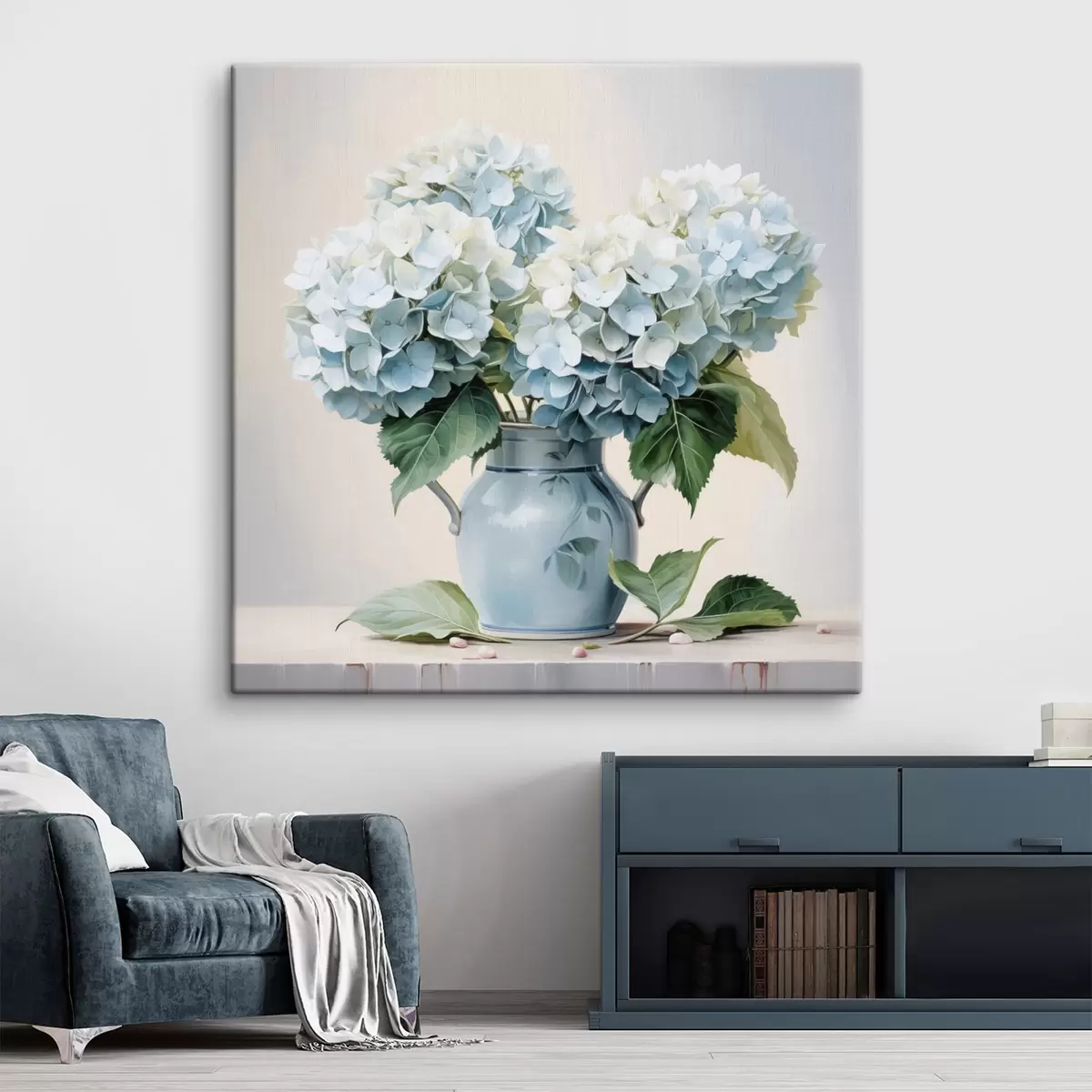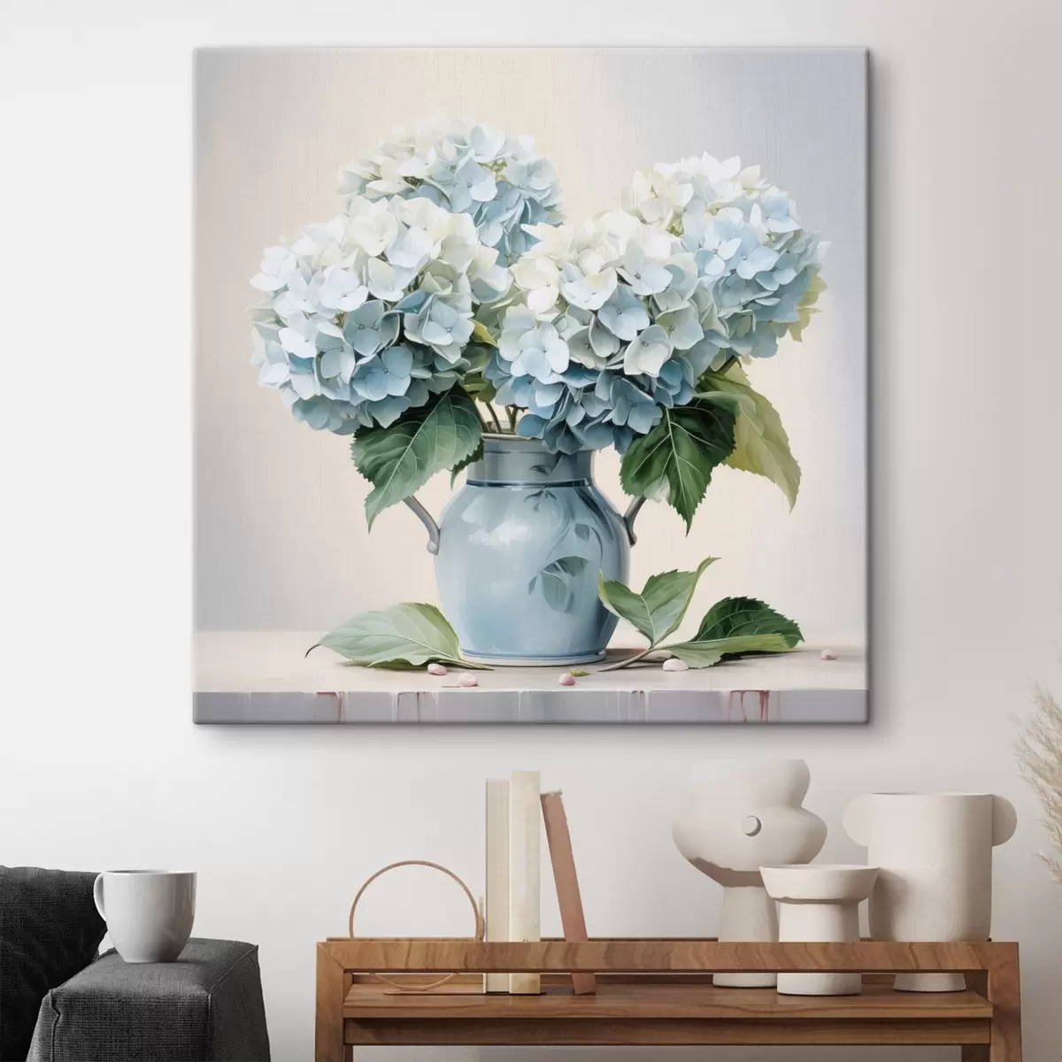 Maalid Värsked hortensiad sinises vaasis heledal taustal Nr s45043