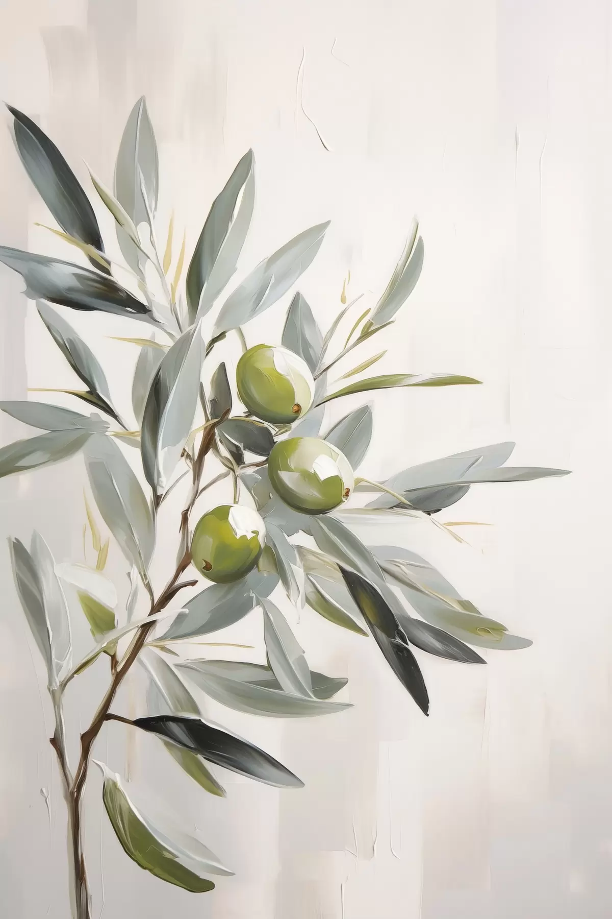 Maalid oliivipuu oks, roheline puu, vaoshoitud toonid, lehed, minimalistlik, looduslik, õlimaal, botaanika Nr s45109