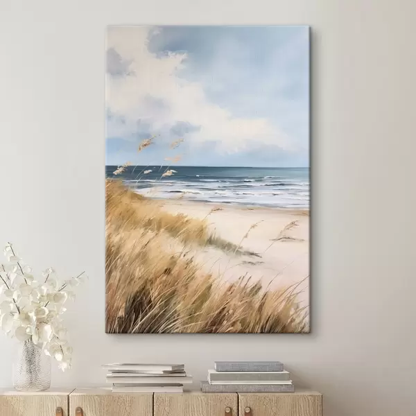 Maalid Liivane rand, esiplaanil kõrge rohi, taustal ookean koos lainetega ja pilvine taevas Nr s45174