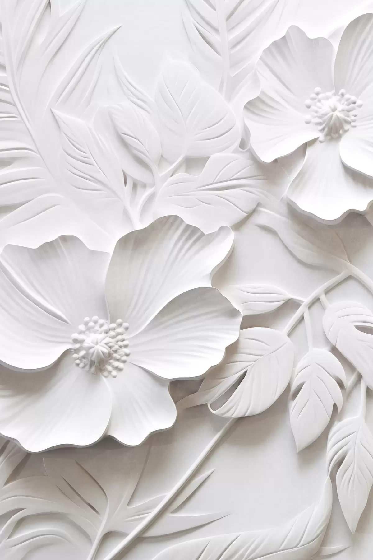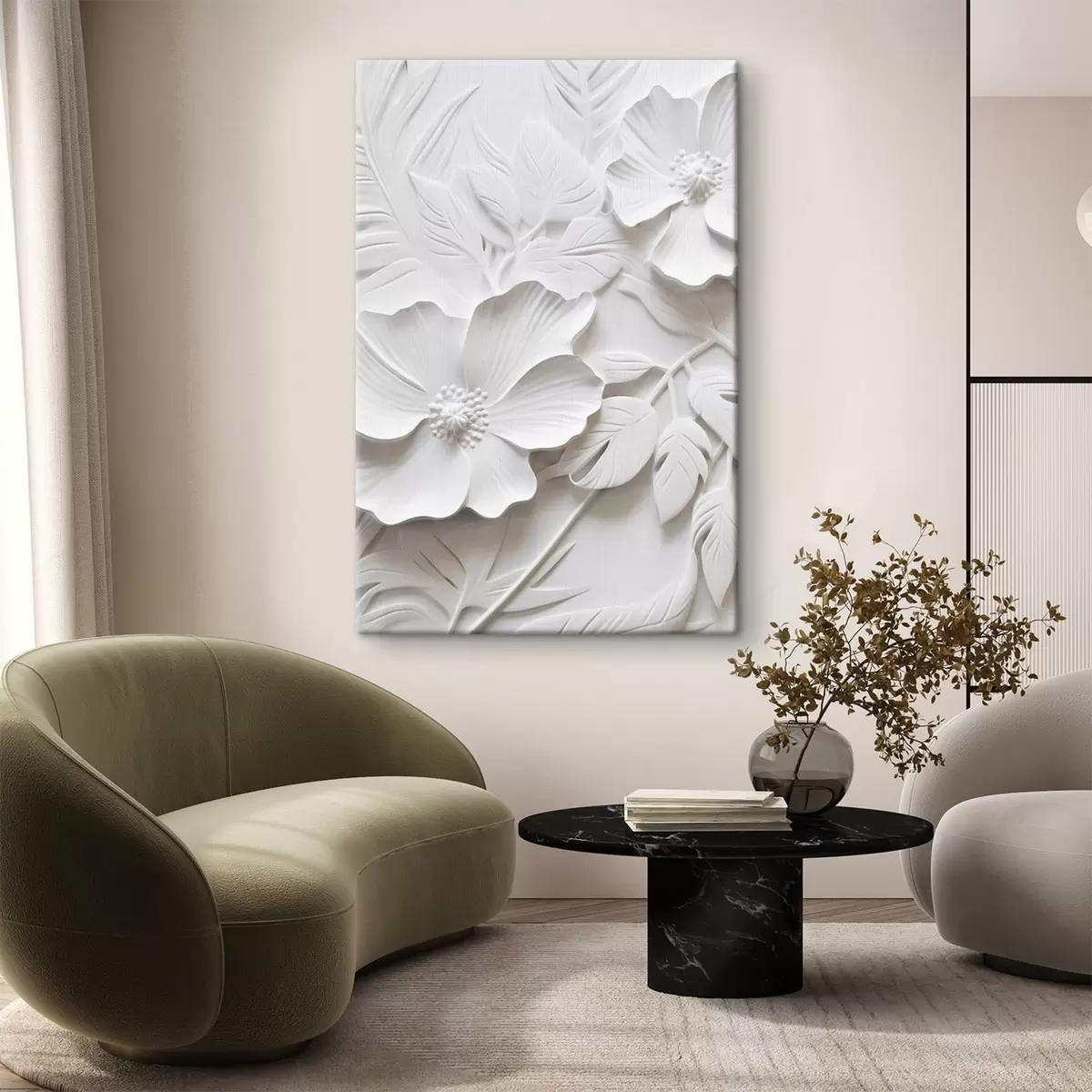 Maalid Dekoratiivsed minimalistlikud valged lilled koos lehtedega, reljeefne imitatsioon, valge taustaga Nr s45180
