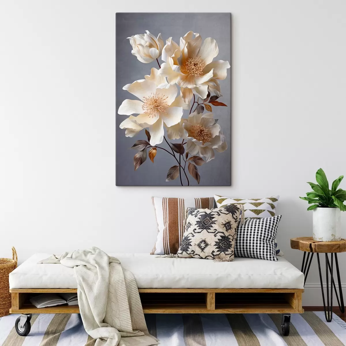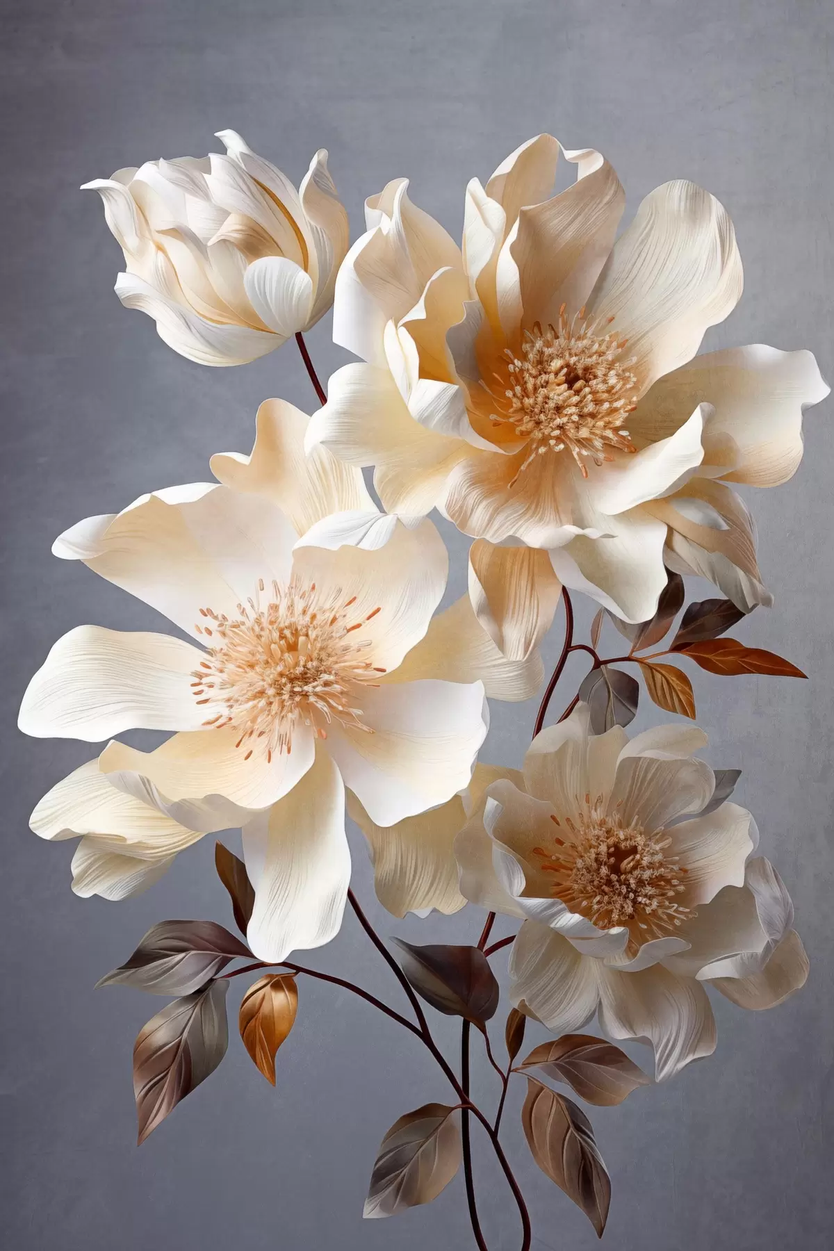 Maalid Tekstuursed lilled oranžide õite ja oranžide lehtedega halli taustal, pehme valgus, elegantne, detailne, realistlik Nr s45181