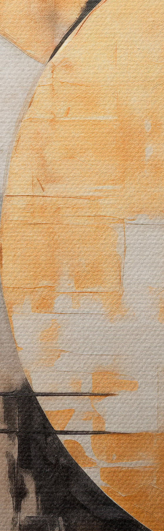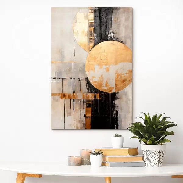 Maalid Abstraktne maal ringide, mustade ja kollaste joontega ning halli ja valge tooniga taustaga Nr s45185
