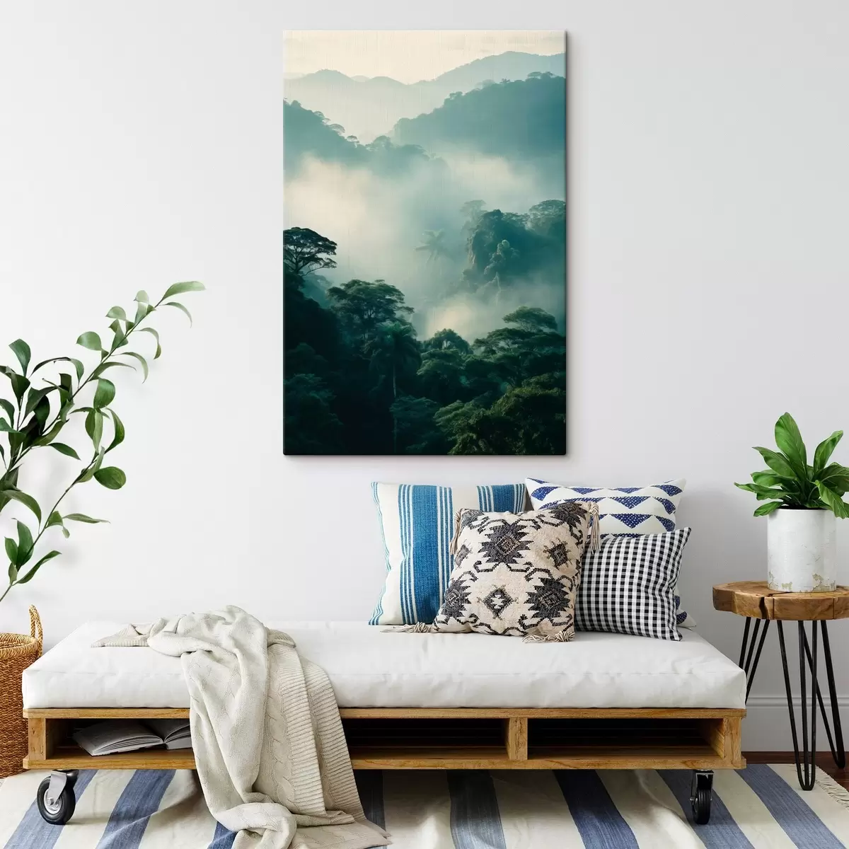 Maalid Troopiline vihmamets koos lopsakate roheliste puude ja paksu udu kihiga , mis loob atmosfääri Nr s45189