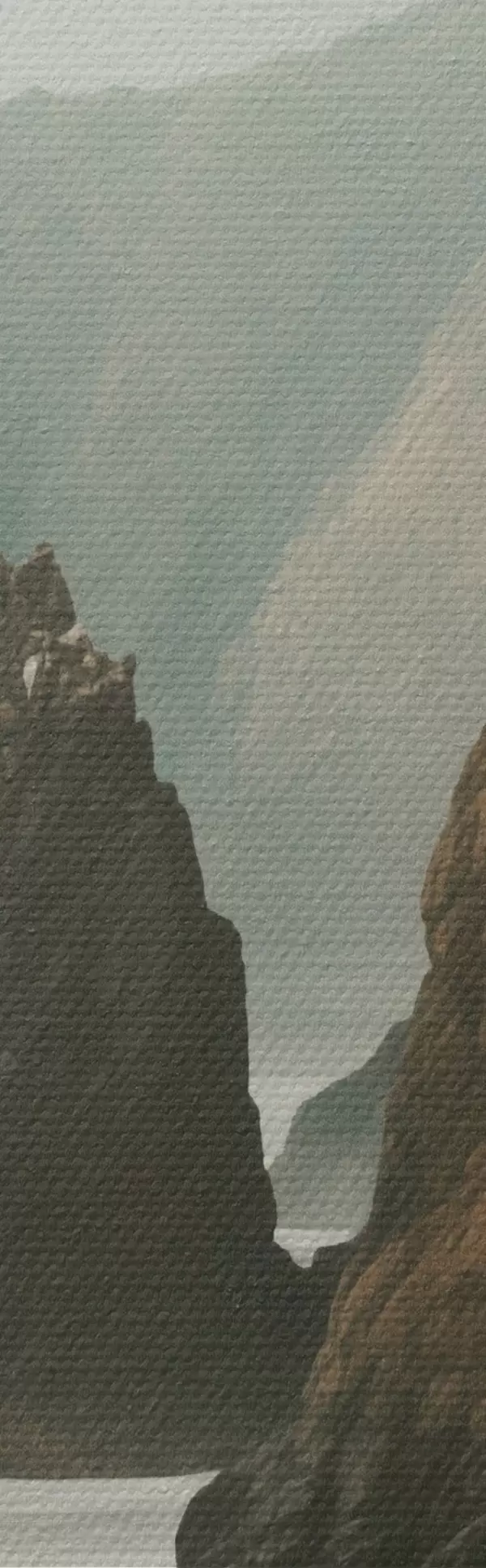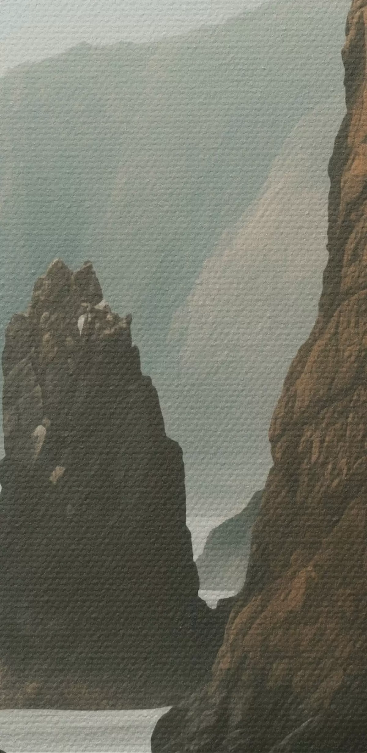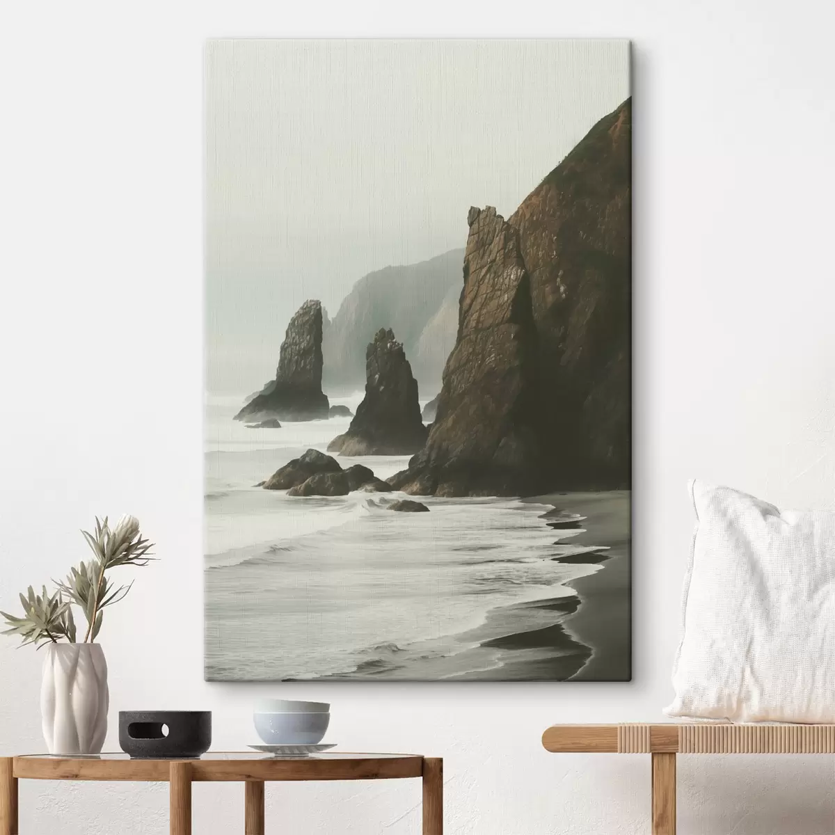 Maalid Kaljused kaljud ja mererannik, lained loksuvad kaldal, meeleoluka atmosfääriga maastik, maapealsed toonid Nr s45193