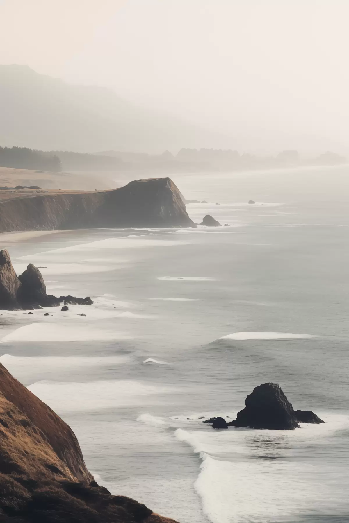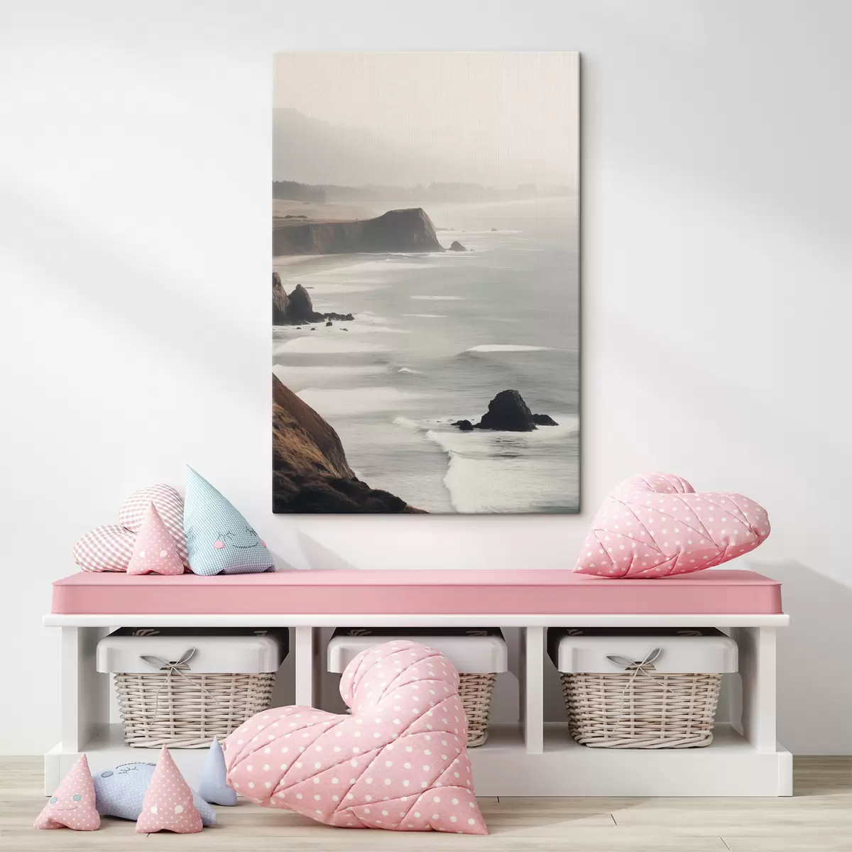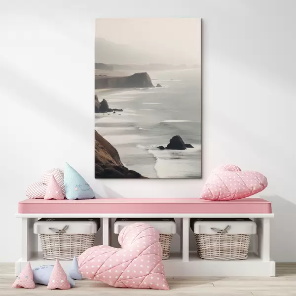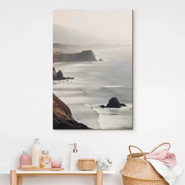 Maalid Kaljused kaljud ja mererannik, lained loksuvad kaldal, meeleoluka atmosfääriga maastik, maapealsed toonid Nr s45194
