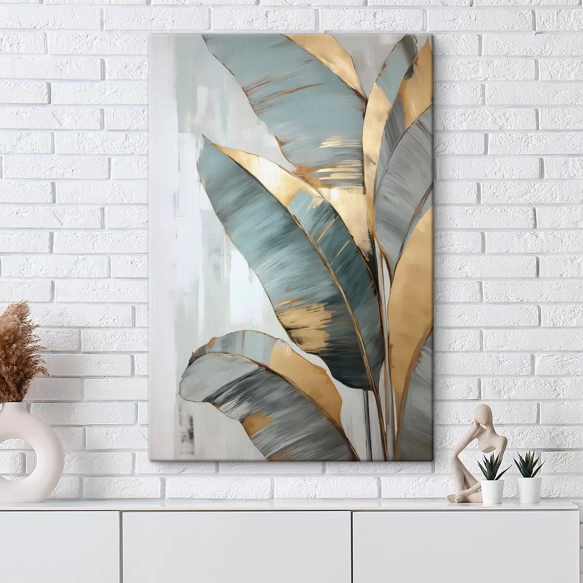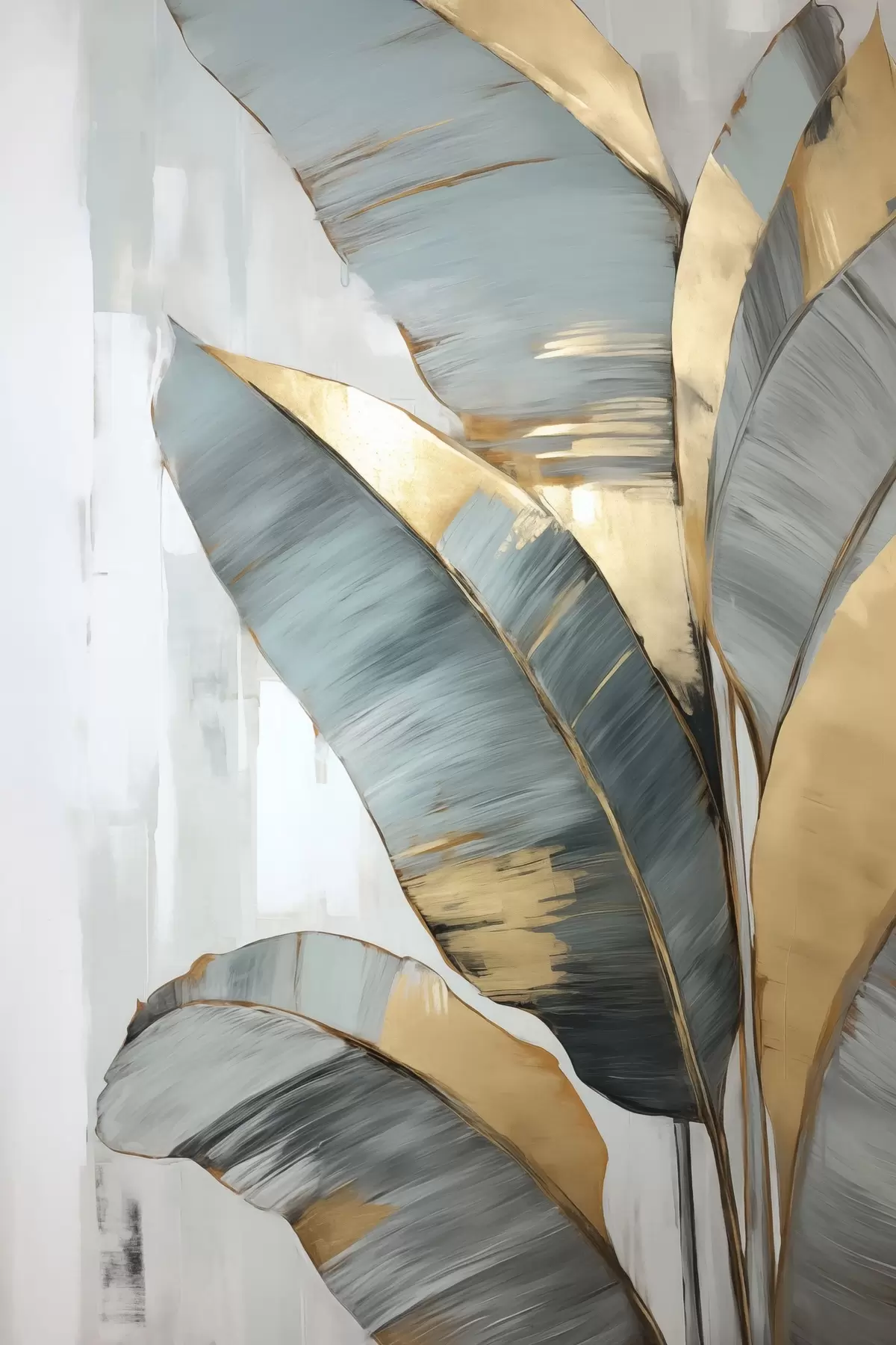 Maalid Valge abstraktse taustaga komplekt sinise, halli ja kollase värvi banaanilehti, millel on nähtavad pintslitõmbed Nr s45551