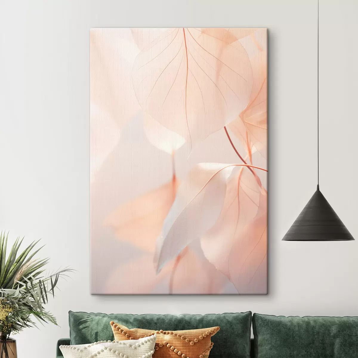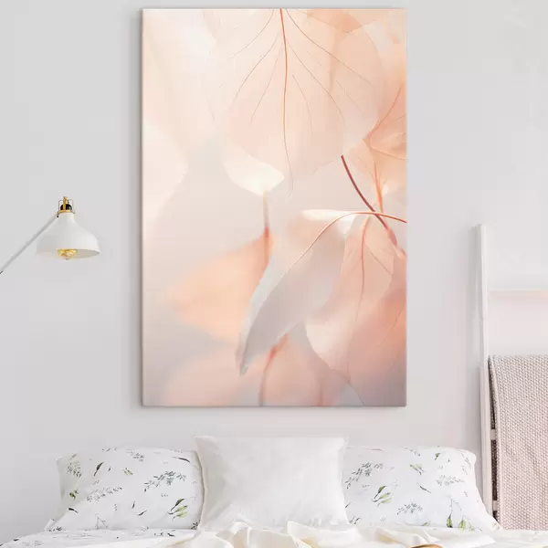 Maalid Läbilõikelised lehed koos õrnade veenidega, pehme virsiku ja valge värvipalett, hägune taust Nr s45556