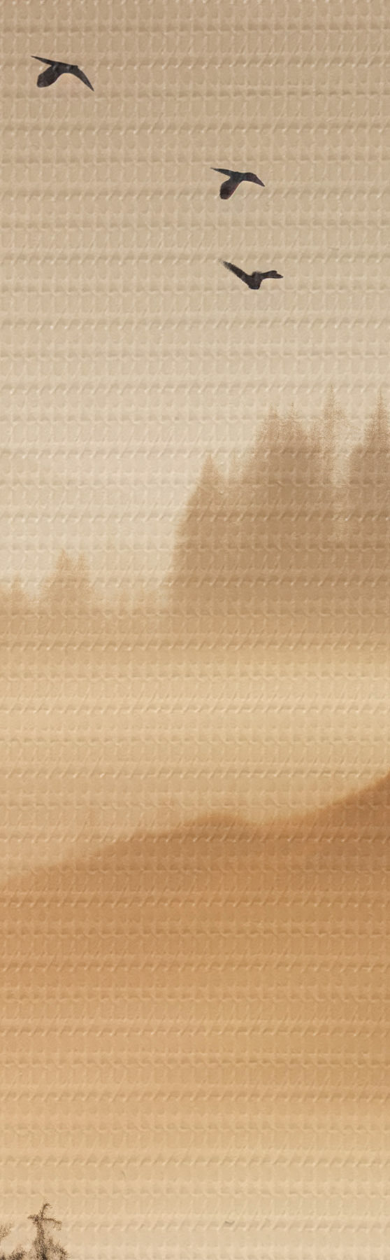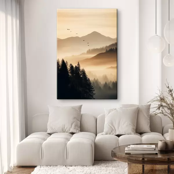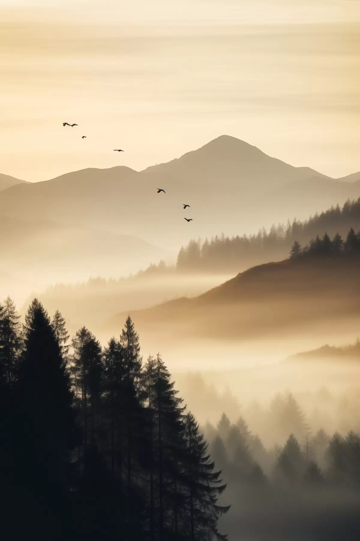 Maalid Mägimaastik koos metsa ja taevas lendavate lindudega , kõik kaetud paksu udukihiga päikesetõusu ajal Nr s45563